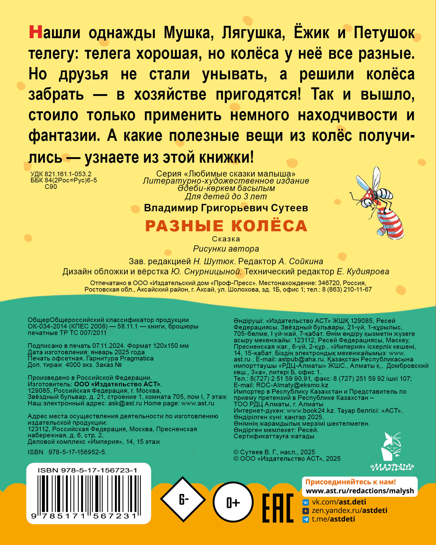 Нашли однажды Мушка, Лягушка, Ёжик и Петушок телегу: телега хорошая, но колёса у неё все разные. Но друзья не стали унывать, а решили колёса забрать — в хозяйстве пригодятся! Так и вышло, стоило только применить немного находчивости и фантазии. А какие полезные вещи из колёс получились — узнаете из этой книжки!
