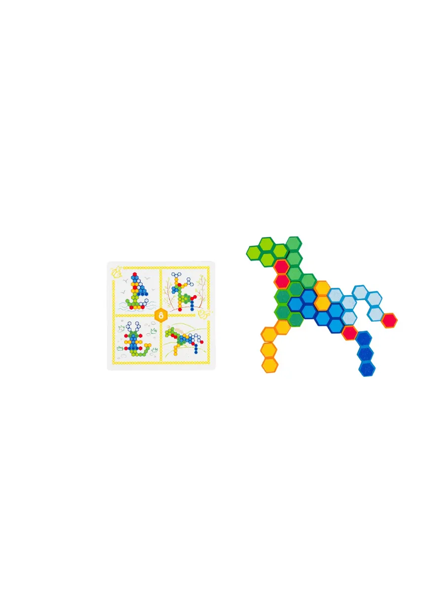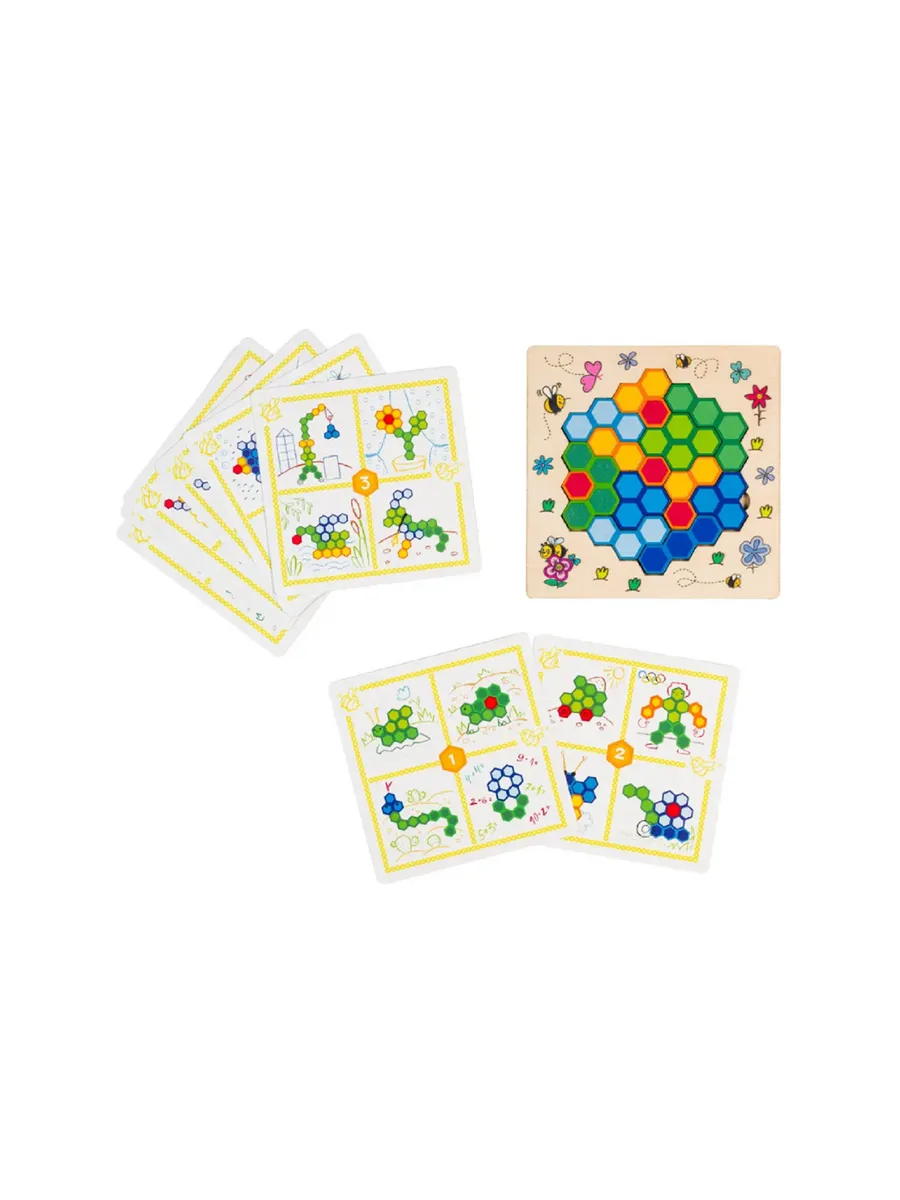 В комплект игры входят 15 деревянных фигур, рамка-основа, 8 карточек с заданиями