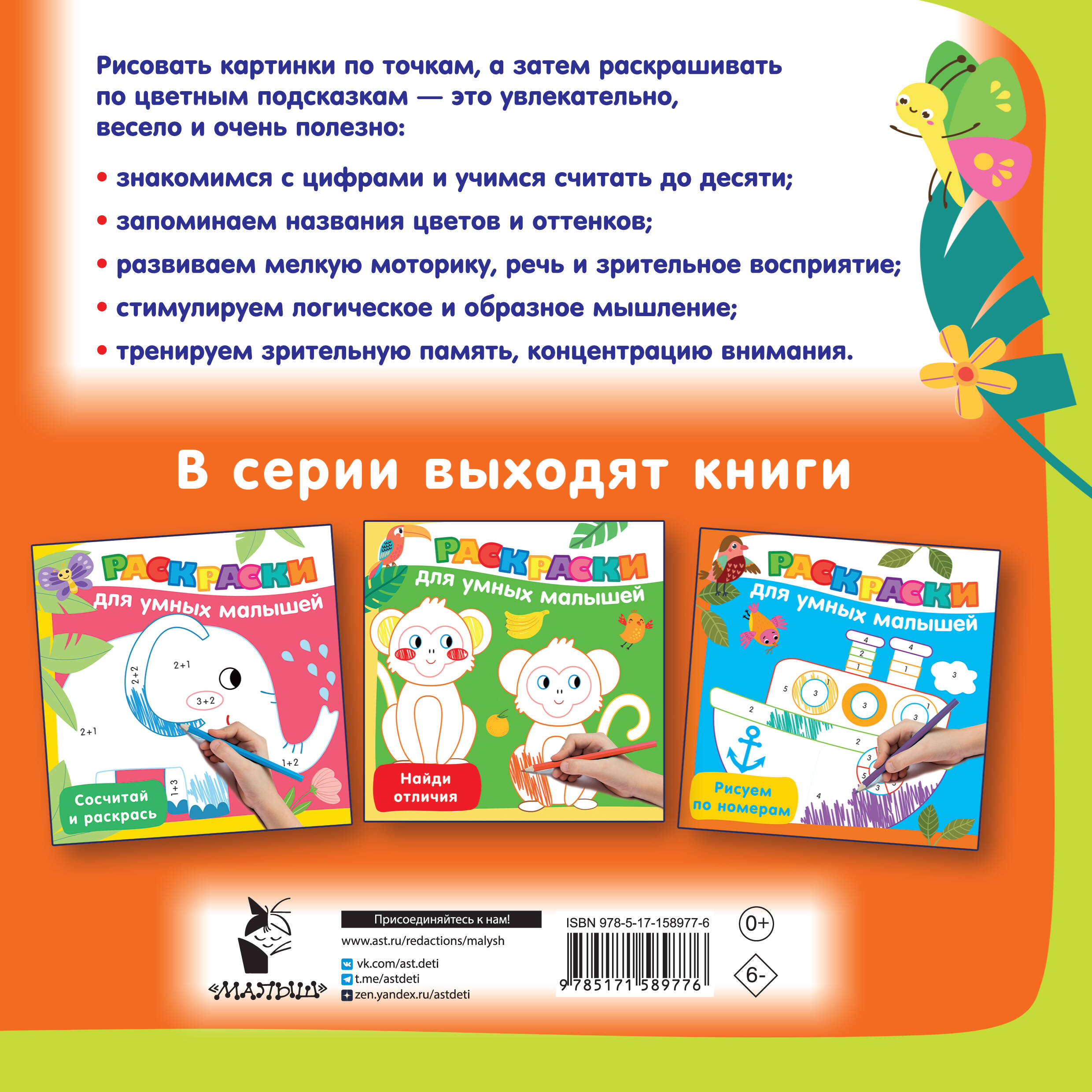Серия «Раскраски для умных малышей» — полезная и незаменимая новинка для будущих первоклассников. Прекрасный выбор для подготовки руки к письму, знакомства с цветами радуги, развития мелкой моторики, графических навыков и интеллектуальной активности малыша. Благодаря ярким и весёлым рисункам каждое задание станет маленькой игрой.