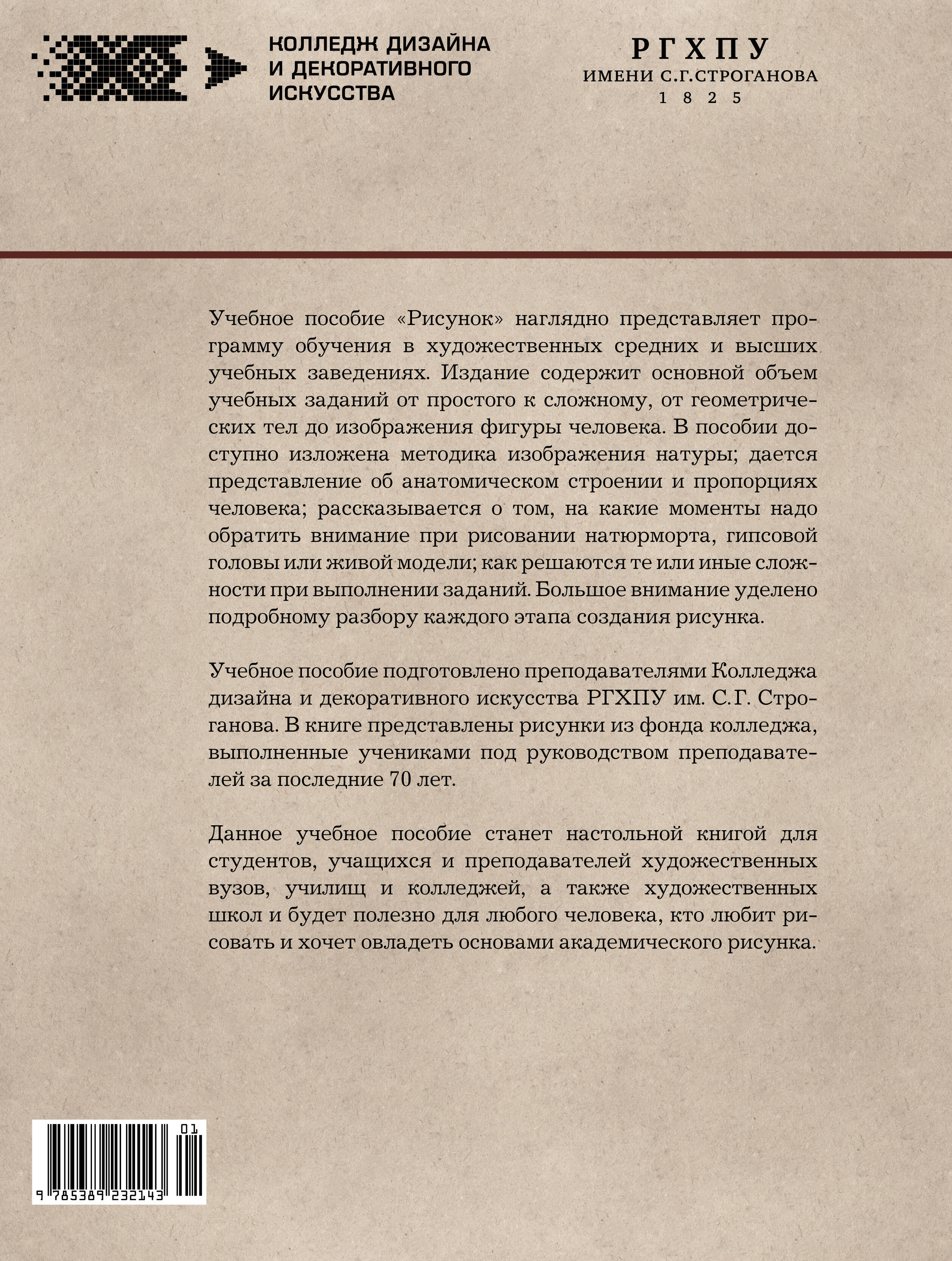 Уникальная возможность научиться основам классического рисунка предложена преподавателями КДДИ РГХПУ им. С.Г. Строганова. Учебное пособие "Рисунок" предназначено и для обучающихся в художественных школах, училищах и колледжах, и для широкого круга читателей.