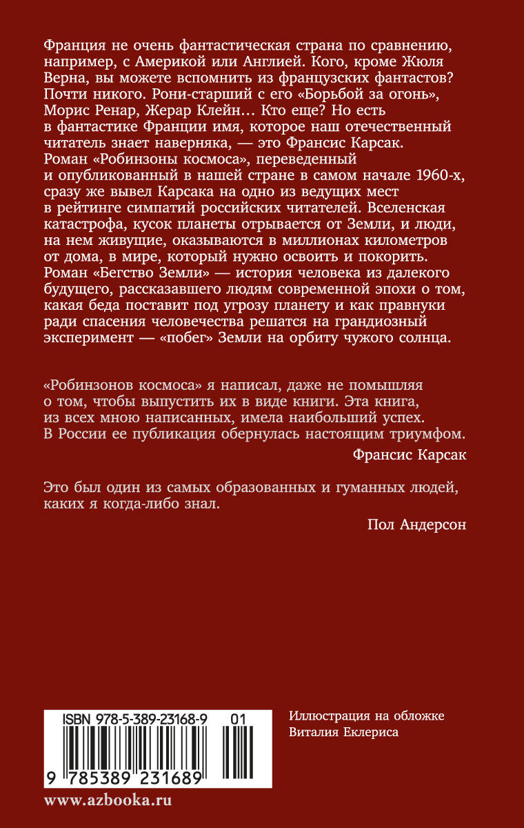Роман "Робинзоны космоса", переведенный и опубликованный в нашей стране в самом начале 1960-х, сразу же вывел Карсака на одно из ведущих мест в рейтинге симпатий российских читателей. Вселенская катастрофа, кусок планеты отрывается от Земли, и люди, на нем живущие, оказываются в миллионах километров от дома, в мире, который нужно освоить и покорить.