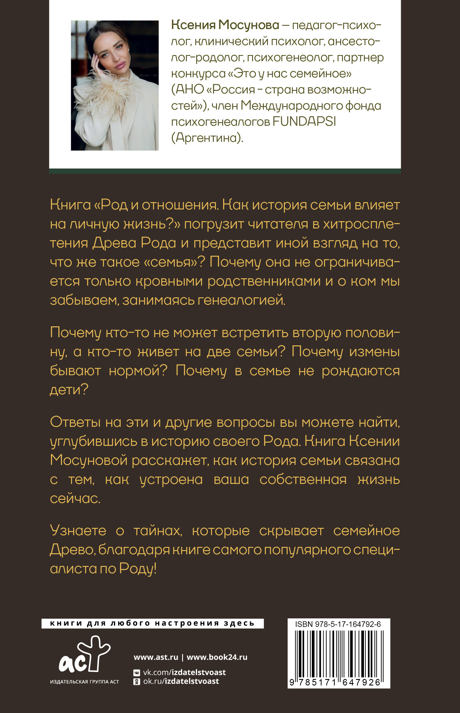В чем современная женщина может найти опору для создания крепкой семьи или успешной карьеры? В книге «Род и отношения» клинический психолог, родолог Ксения Мосунова рассказывает о том, как любая женщина (и мужчина!) может найти опору, наладив внутренние связи в роду, опираясь на его историю. Благодаря книге вы узнаете, как менялось отношение к семье и браку с течением времени, как история семьи влияет на нашу личную жизнь, почему часто мы выбираем «не тех» партнеров, почему в вашей судьбе повторяются родовые сценарии и почему не получается выйти замуж и родить детей? Благодаря книге Ксении Мосуновой, вы не только разберетесь в своей родословной, но и сможете составить генеалогическое древо при помощи геносоциограммы. Книга «Род и отношения» поможет разобраться в хитросплетении семейных связей и навести в них порядок, сохранить семью и бизнес, и даже поправить здоровье через проработку отношений с родителями и предками. Вы сможете взглянуть на свою жизнь иначе - через историю вашей семьи и рода. Это станет началом пути к качественным изменениям.