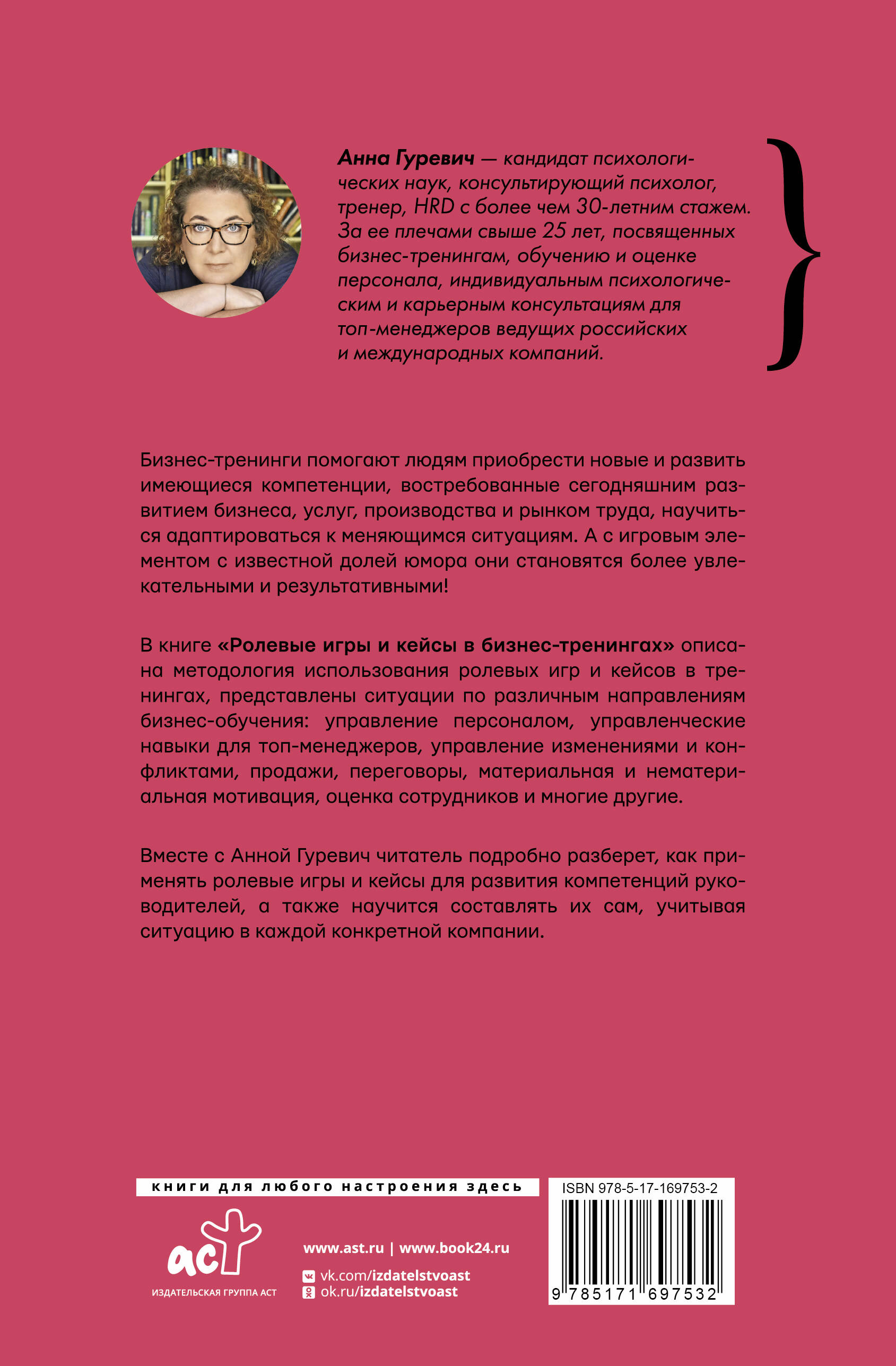В книге "Ролевые игры и кейсы в бизнес-тренингах" описана методология использования ролевых игр и кейсов в тренингах, представлены ситуации по различным направлениям бизнес-обучения: управление персоналом, управленческие навыки для топ-менеджеров, управление изменениями и конфликтами, продажи, переговоры, материальная и нематериальная мотивация, оценка сотрудников и многие другие.