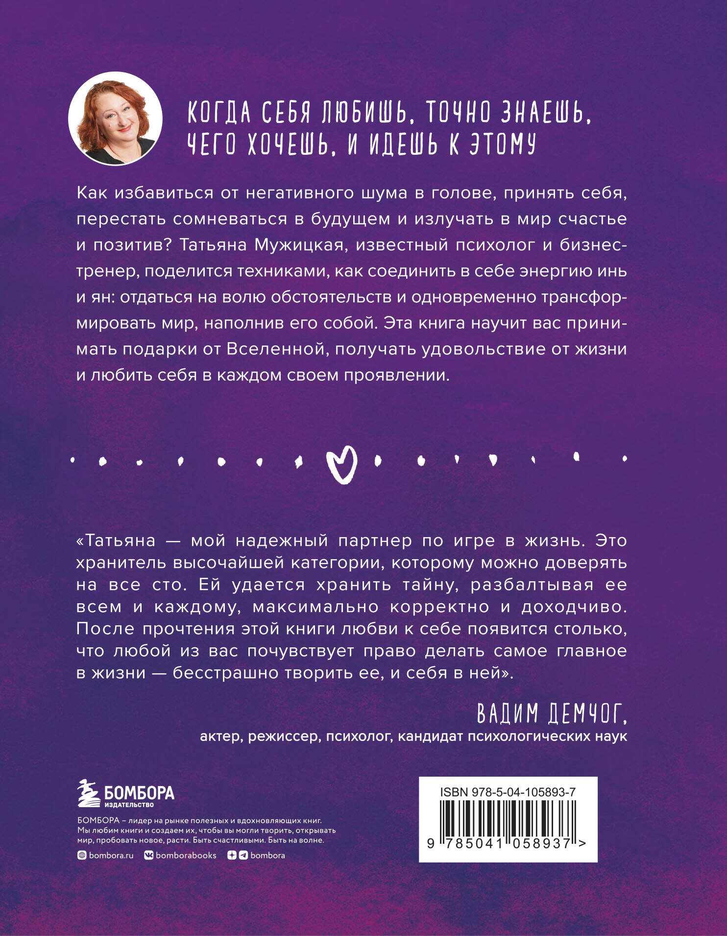 «Татьяна — мой надежный партнер по игре в жизнь. Это хранитель высочайшей категории, которому можно доверять на все сто. Ей удается хранить тайну, разбалтывая ее всем и каждому, максимально корректно и доходчиво. После прочтения этой книги любви к себе появится столько, что любой из вас почувствует право делать самое главное в жизни — бесстрашно творить ее и себя в ней». — Вадим Демчог, актер, режиссер, психолог, кандидат психологических наук