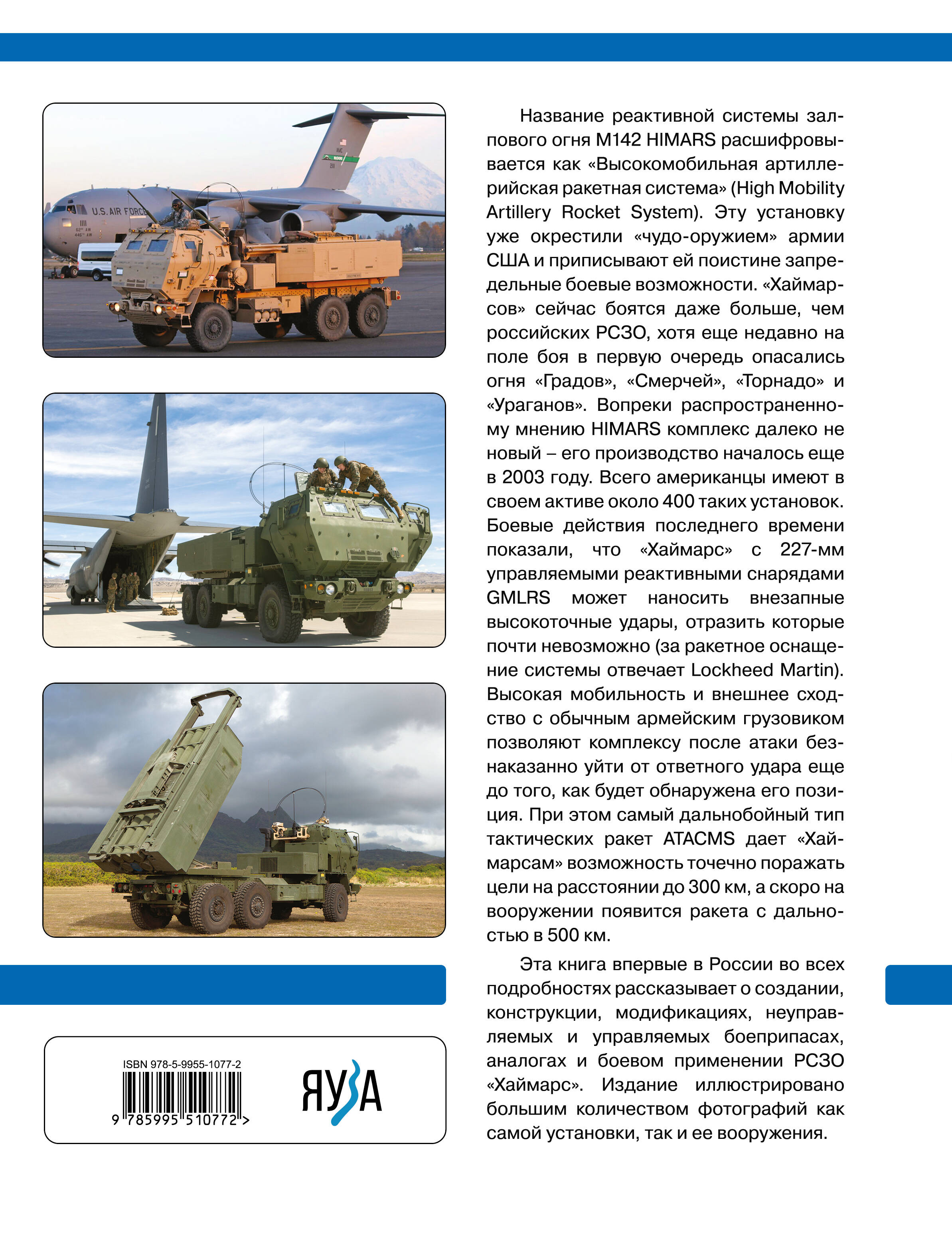 Новая книга известного историка военной техники впервые в России во всех подробностях рассказывает о создании, конструкции, модификациях, неуправляемых и управляемых боеприпасах, аналогах и боевом применении РСЗО «Хаймарс». Издание иллюстрировано большим количеством фотографий как самой установки, так и ее вооружения.