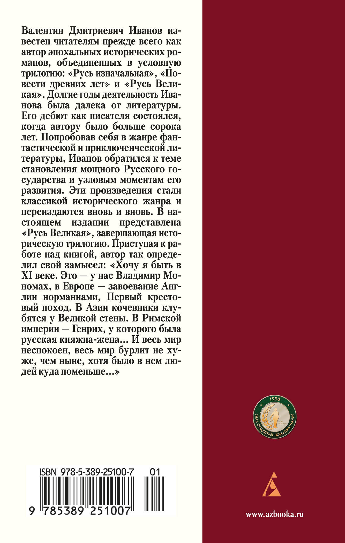 Валентин Иванов известен читателям прежде всего как автор эпохальных исторических романов, обращенных к прошлому Древней Руси: "Русь изначальная", "Повести древних лет", "Русь Великая". В настоящем издании представлен завершающий цикл роман "Русь Великая". Приступая к работе над книгой, автор так определил свой замысел: "Хочу я быть в XI веке. Это — у нас Владимир Мономах, в Европе — завоевание Англии норманнами, Первый крестовый поход. В Азии кочевники клубятся у Великой стены. В Римской империи — Генрих, у которого была русская княжна-жена... И весь мир неспокоен, весь мир бурлит не хуже, чем ныне, хотя было в нем людей куда поменьше…" И действительно, писатель не ограничился описанием в книге Великой Руси, он перемещается "по странам и континентам через XI век", от берегов Америки до монгольских степей, от Руси до Византии. И каждая глава — это отдельная повесть. В то же время все части составляют единый роман, главной темой которого является становление мощного Русского государства на фоне мировых исторических катаклизмов.