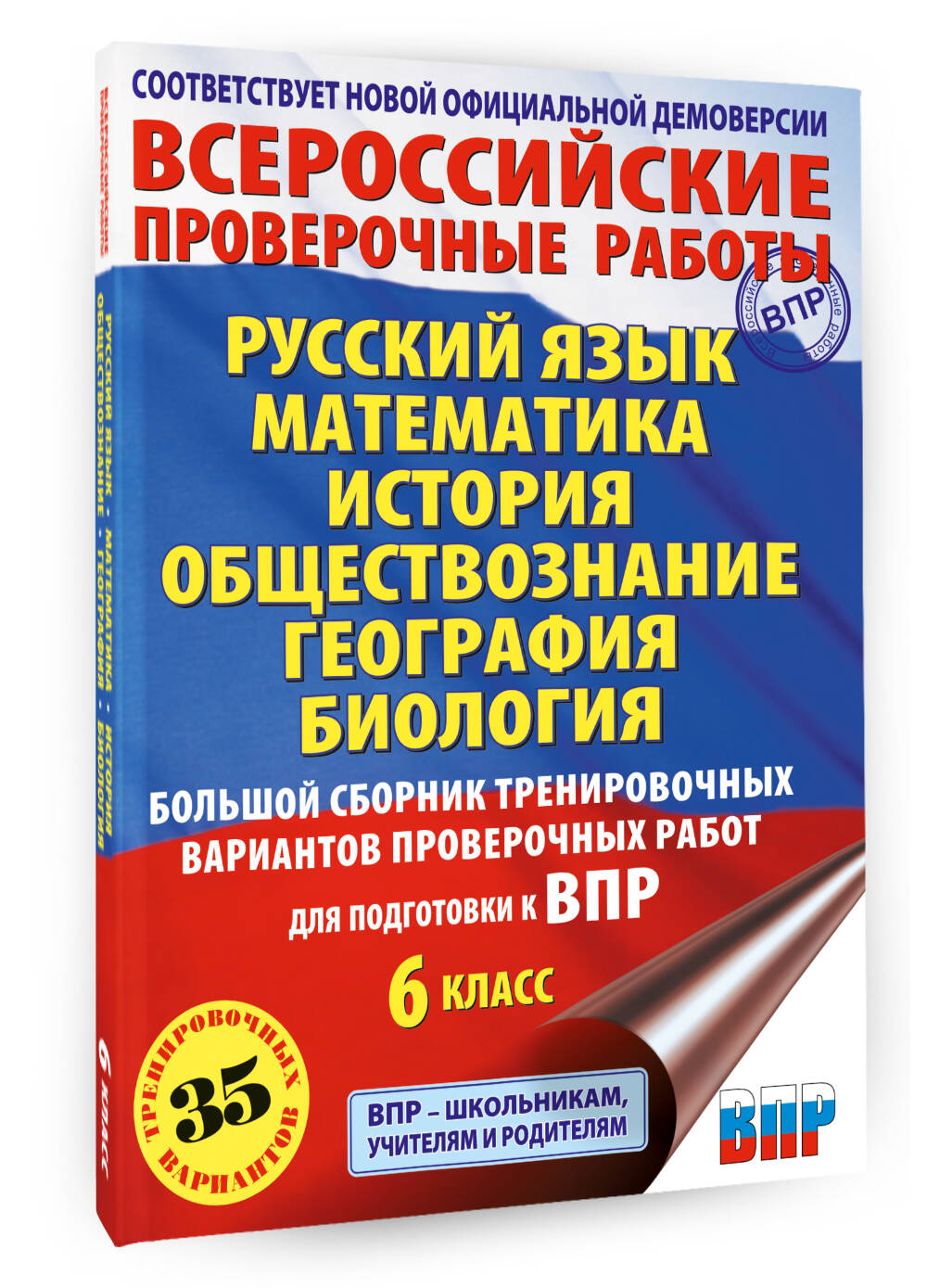 Пособие содержит 35 тренировочных вариантов проверочных работ по русскому языку, математике, истории, обществознанию, географии и биологии — предметам, по которым пишут ВПР в 6 классе на всей территории страны.