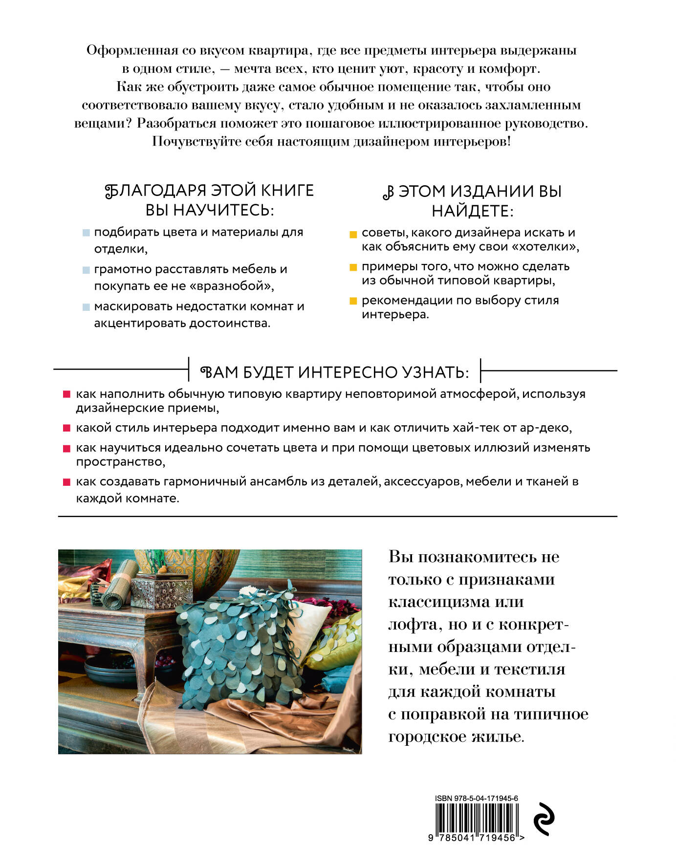Для всех, кто интересуется разными стилями интерьера, подбором цветов, правилами расстановки мебели и мечтает создать гармоничный ансамбль из дизайнерских деталей и аксессуаров, эта энциклопедия станет необходимым руководством к правильному действию.