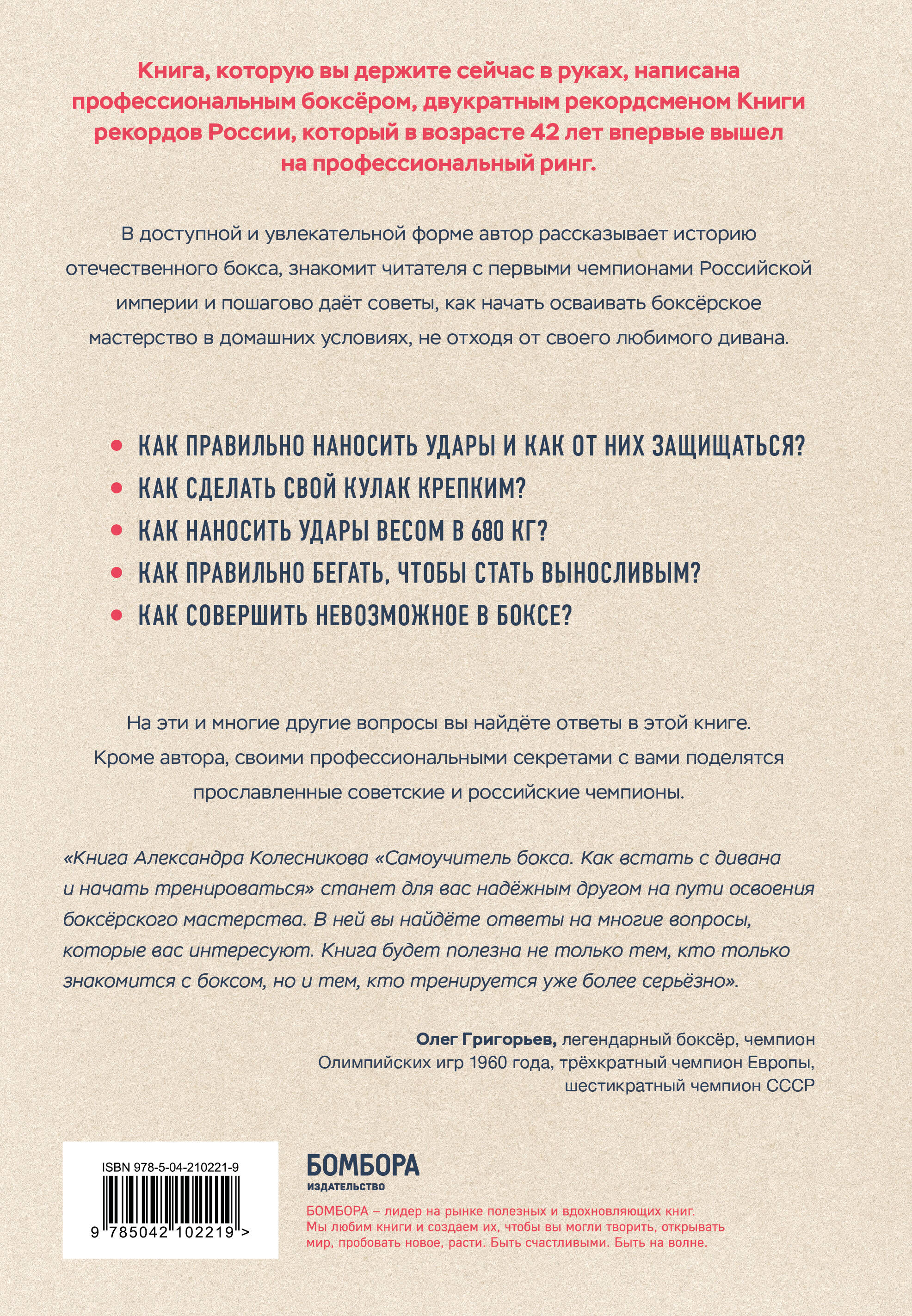 «Книга Александра Колесникова "Самоучитель бокса. Как встать с дивана и начать тренироваться" станет для вас надёжным другом на пути освоения боксёрского мастерства. В ней вы найдёте ответы на многие вопросы, которые вас интересуют. Книга будет полезна не только тем, кто только знакомится с боксом, но и тем, кто тренируется уже более серьёзно». — Олег Григорьев, легендарный боксёр, чемпион Олимпийских Игр 1960 года, трёхкратный чемпион Европы, шестикратный чемпион СССР