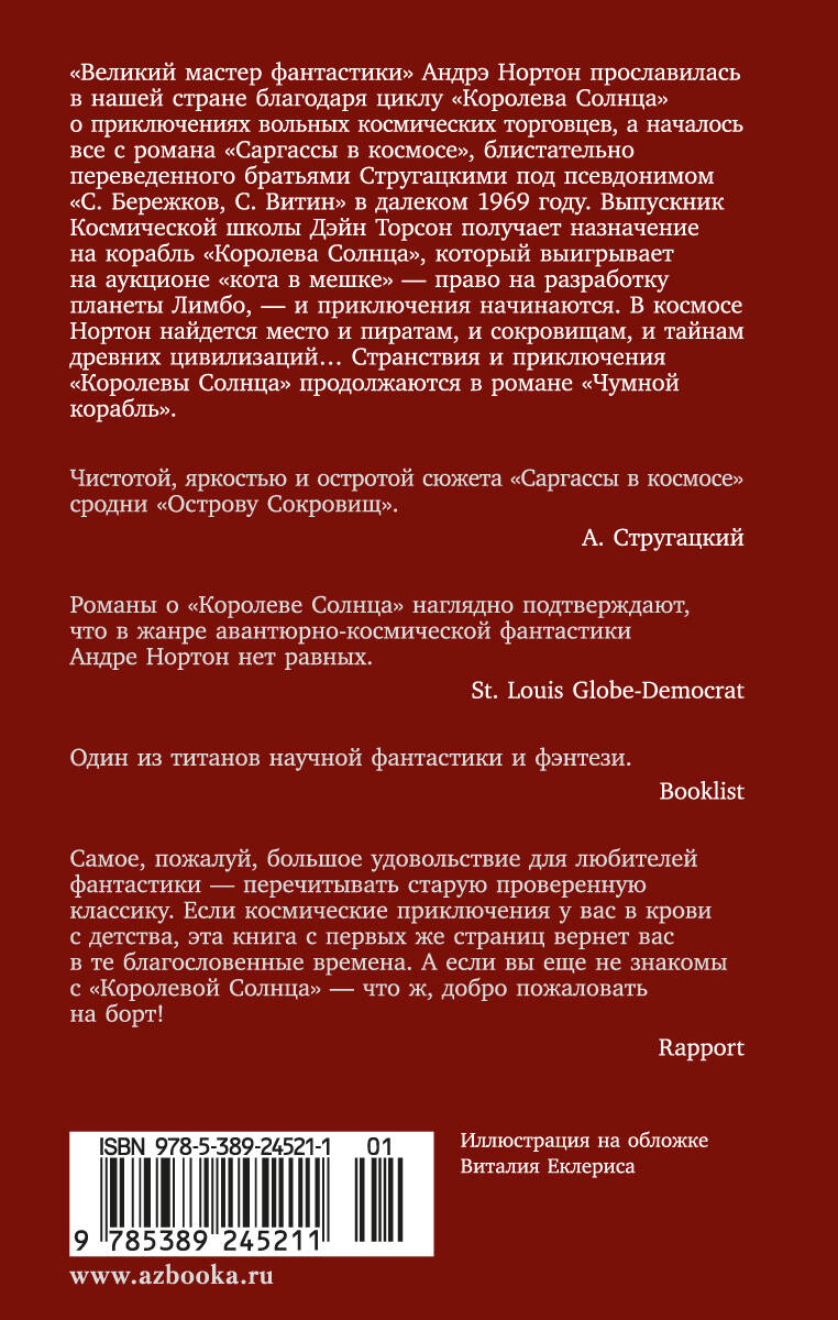 "Великий мастер фантастики" Андрэ Нортон прославилась в нашей стране благодаря циклу "Королева Солнца" о приключениях вольных космических торговцев, а началось все с романа "Саргассы в космосе", блистательно переведенного братьями Стругацкими под псевдонимом "С. Бережков, С. Витин" в далеком 1969 году. Выпускник Космической школы Дэйн Торсон получает назначение на корабль "Королева Солнца", который выигрывает на аукционе "кота в мешке" — право на разработку планеты Лимбо, — и приключения начинаются. В космосе Нортон найдется место и пиратам, и сокровищам, и тайнам древних цивилизаций…