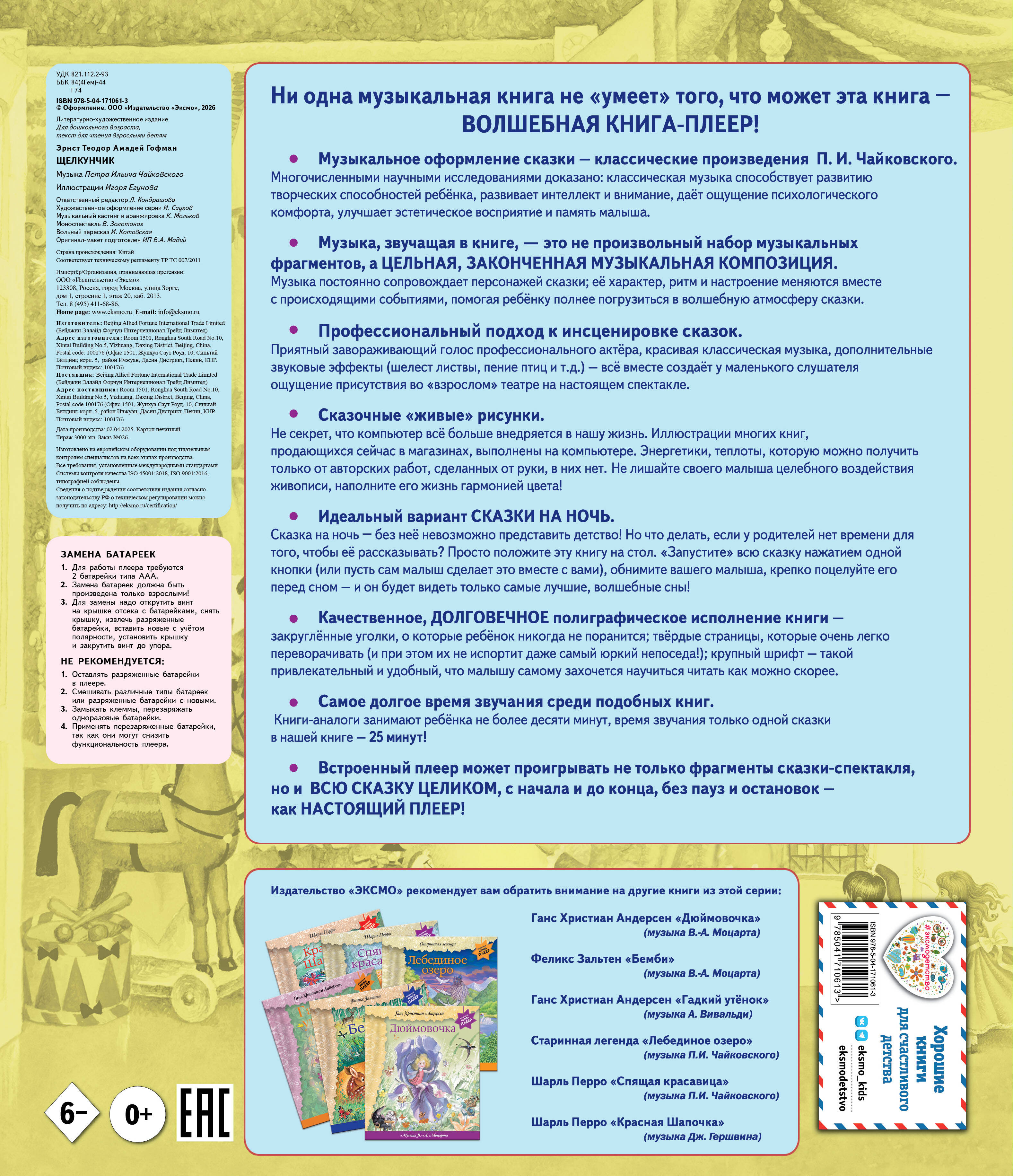 Музыкальная книга-плеер — это прекрасное сочетание традиционной книги и современных технологий. Красочное иллюстрированное издание классической сказки дополнено звуковым модулем-плеером. Яркие, крупные кнопки на панели модуля позволяют прослушать сказку как по главам, так и полностью, от начала до конца, а также сделать паузу в прослушивании. Время звучания всей сказки — 25 минут, РЕКОРД СРЕДИ ЗВУКОВЫХ КНИГ. Наша книга — это идеальный вариант «сказки на ночь»: пока ребёнок слушает книгу и засыпает, взрослые могут заняться своими делами. Профессиональное художественное чтение текста сопровождается завершёнными музыкальными композициями — шедеврами мировой классики. Только в наших книгах-плеерах используются дополнительные звуки (шелест листвы, пение птиц и т. п.), создающие эффект присутствия на настоящем спектакле!