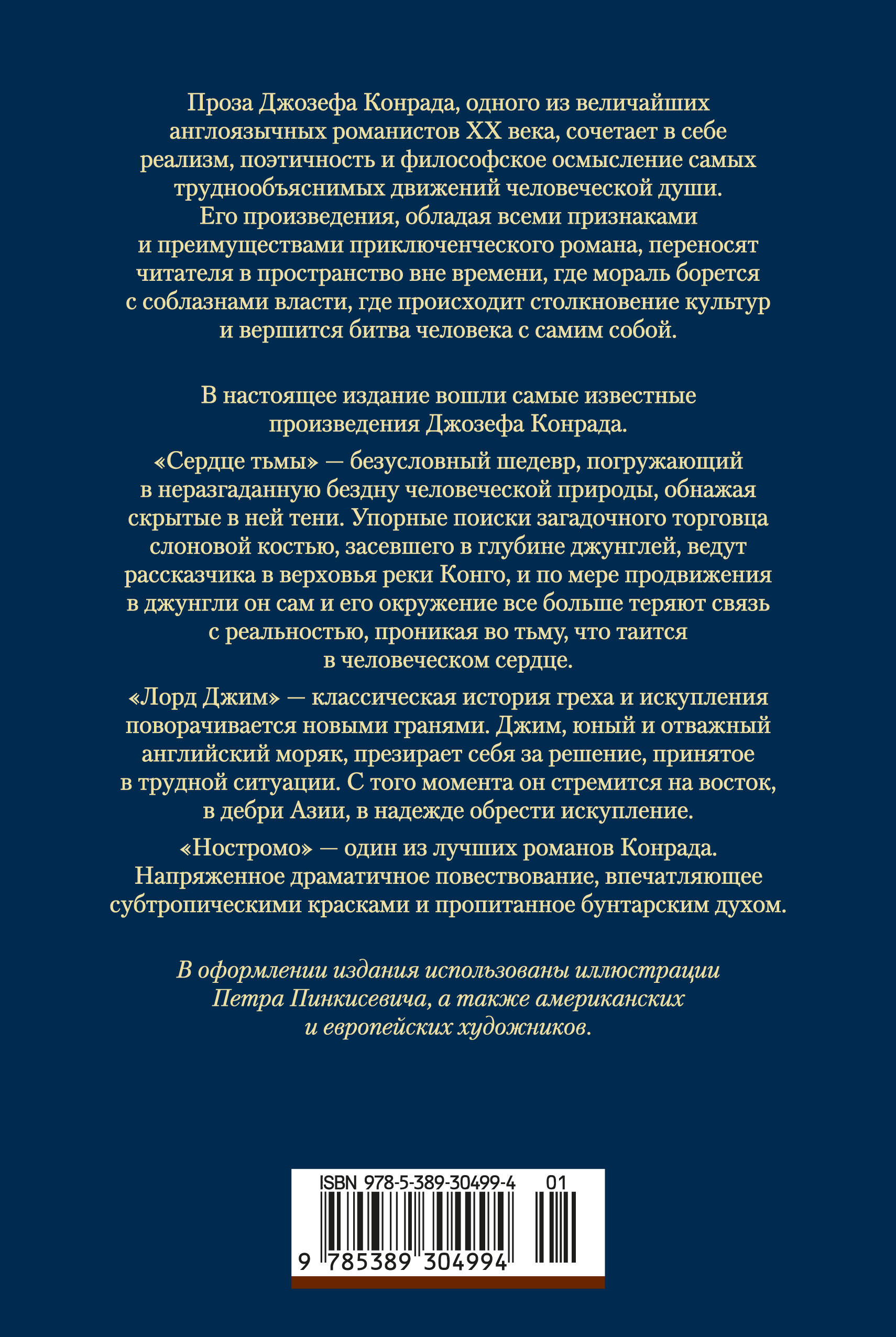 «Сердце тьмы», «Лорд Джим», «Ностромо» — три лучших произведения Джозефа Конрада, одного из величайших англоязычных романистов XX века, чья проза сочетает в себе реализм, поэтичность и философское осмысление самых труднообъяснимых движений человеческой души. Его произведения, обладая всеми признаками и преимуществами приключенческого романа, переносят читателя в пространство вне времени, где мораль борется с соблазнами власти, где происходит столкновение культур и вершится битва человека с самим собой.