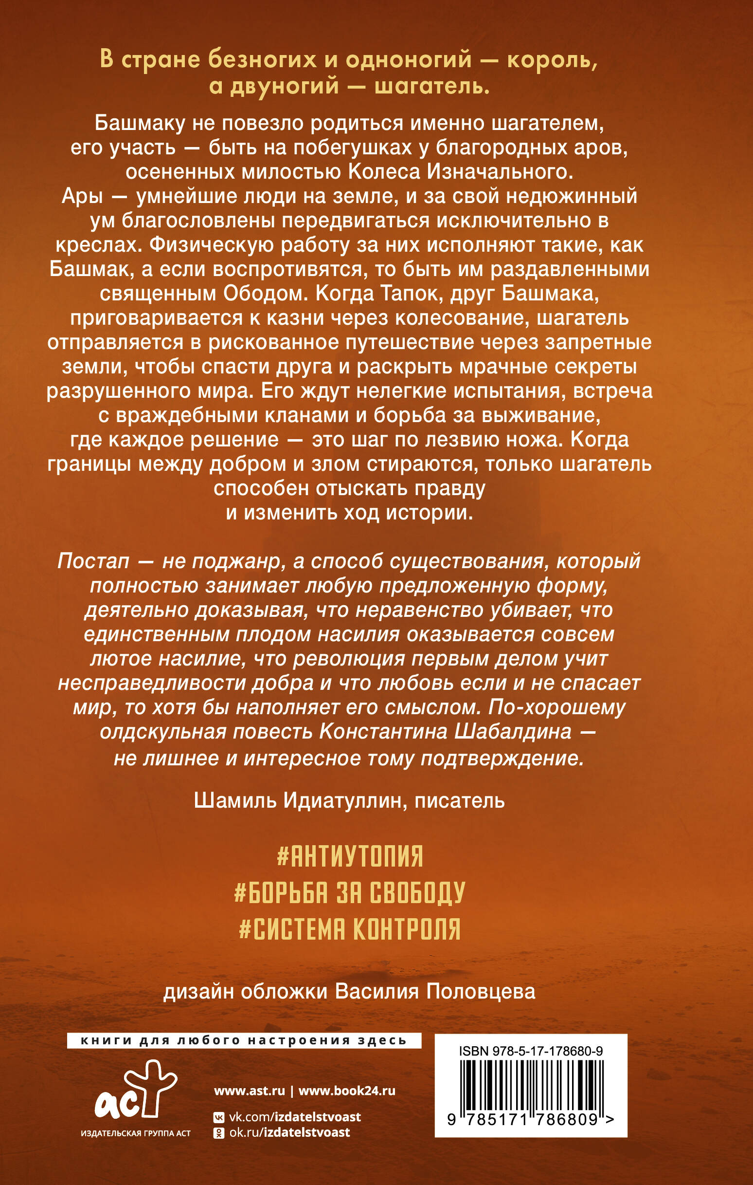 Башмаку не повезло родиться именно шагателем, его участь — быть на побегушках у благородных аров, осененных милостью Колеса Изначального. Ары — умнейшие люди на земле, и за свой недюжинный ум благословлены передвигаться исключительно в креслах. Физическую работу за них исполняют такие, как Башмак, а если воспротивятся, то быть им раздавленными священным Ободом. Когда Тапок, друг Башмака, приговаривается к казни через колесование, шагатель отправляется в рискованное путешествие через запретные земли, чтобы спасти друга и раскрыть мрачные секреты разрушенного мира. Его ждут нелегкие испытания, встреча с враждебными кланами и борьба за выживание, где каждое решение — это шаг по лезвию ножа. Когда границы между добром и злом стираются, только шагатель способен отыскать правду и изменить ход истории.