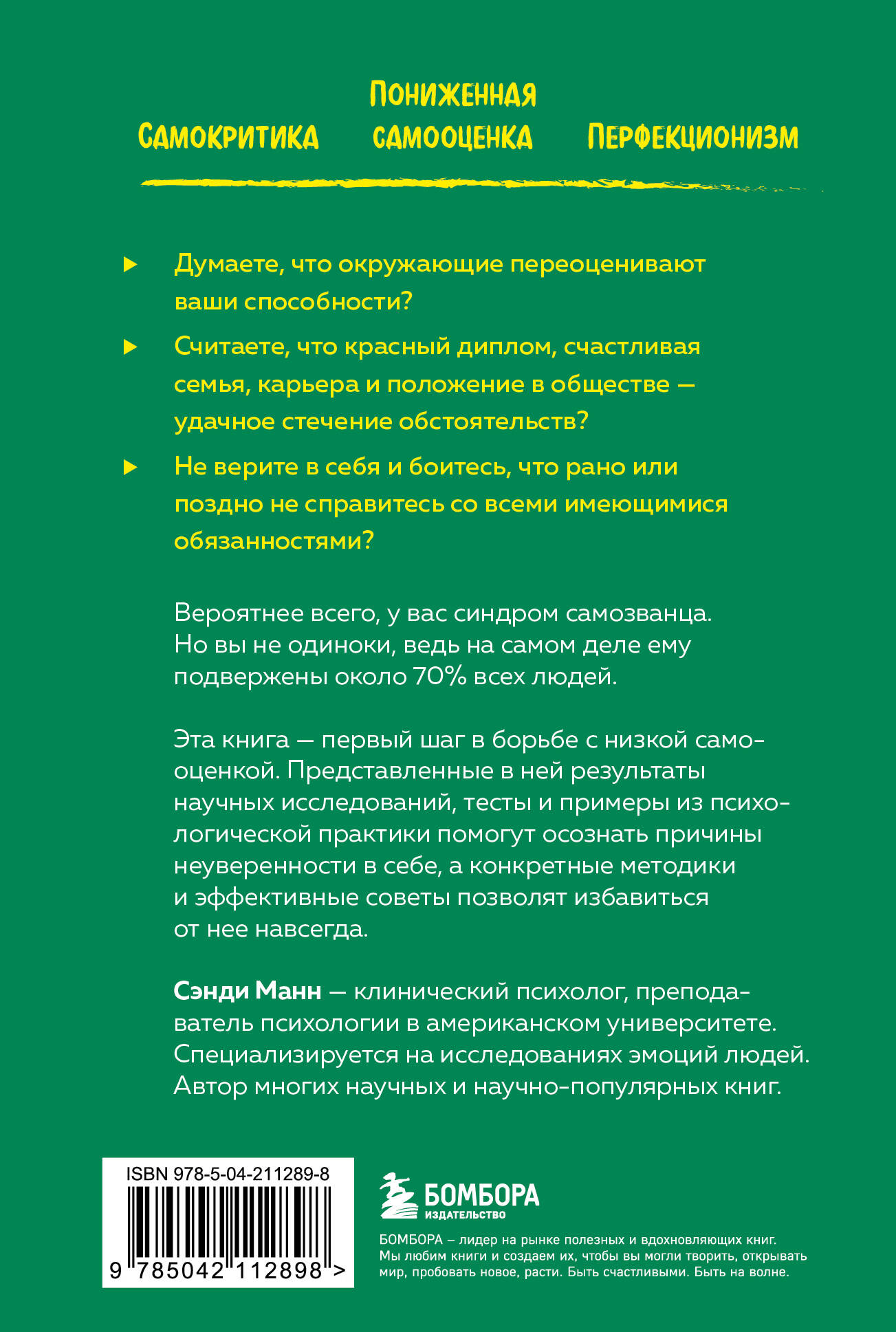 Думаете, что окружающие переоценивают ваши способности? Считаете, что красный диплом, счастливая семья, карьера и положение в обществе — удачное стечение обстоятельств? Не верите в себя и боитесь, что рано или поздно не справитесь со всеми имеющимися обязанностями? Вероятнее всего, у вас синдром самозванца. Но вы не одиноки, ведь на самом деле ему подвержены около 70% всех людей, и даже такие, как Том Хэнкс. Уменьшить всемирную статистику и помочь самому себе не так уж и сложно! В этой книге вы найдете тесты для диагностики синдрома самозванца у себя и своих близких, а также большое количество практических советов и упражнений для борьбы с ним.