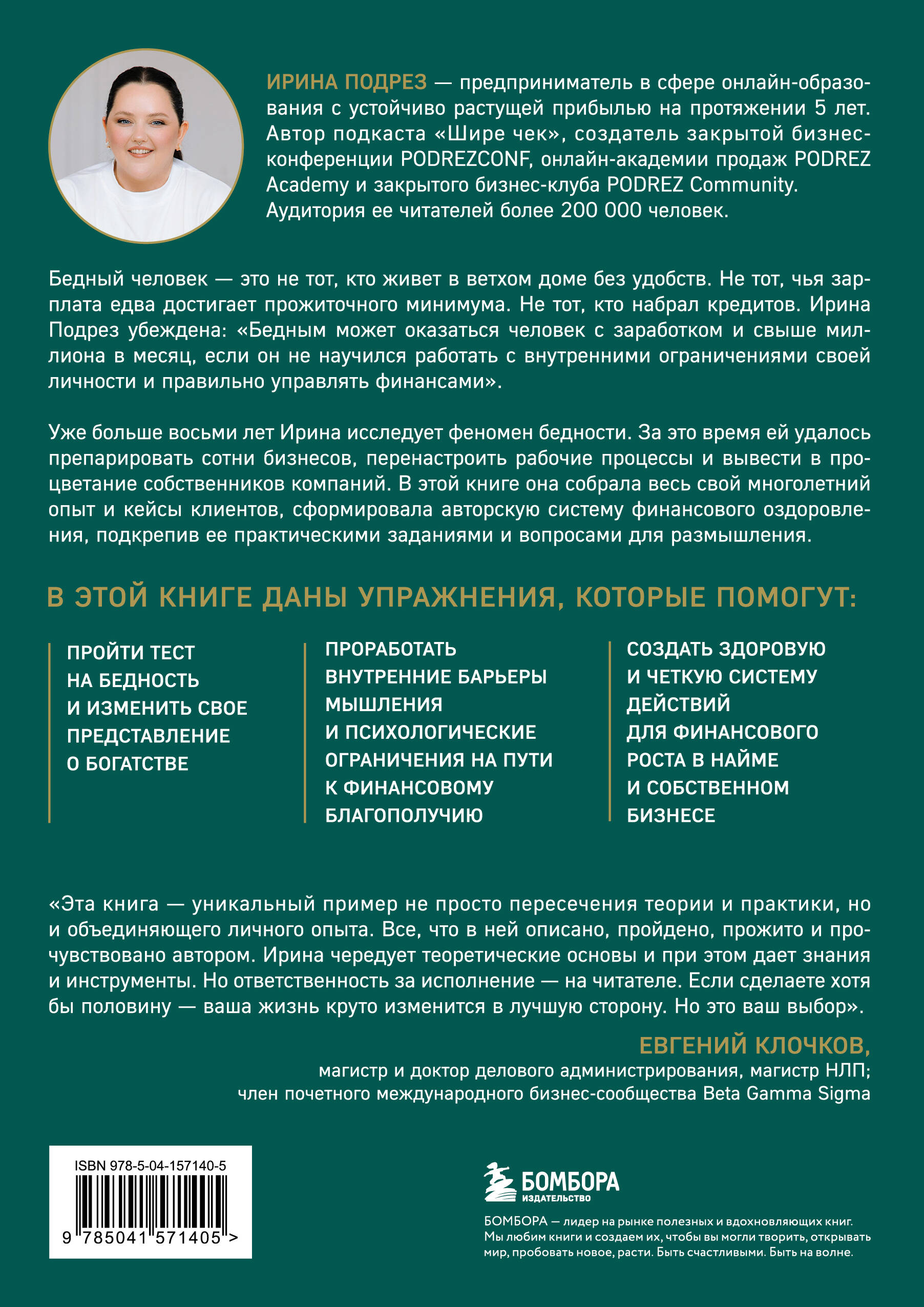 Бедный человек — это не тот, кто живет в ветхом доме без удобств. Не тот, чья зарплата едва достигает прожиточного минимума. Не тот, кто набрал кредитов. Ирина Подрез убеждена: «Бедность — это свойство нашей психики и мышления, а уже потом, как следствие, качество наших материальных результатов, способность их удерживать и преумножать. Бедным может оказаться человек с заработком и свыше миллиона в месяц, если он не научился работать с внутренними ограничениями своей личности и правильно действовать на устойчивый результат и здоровый рост».