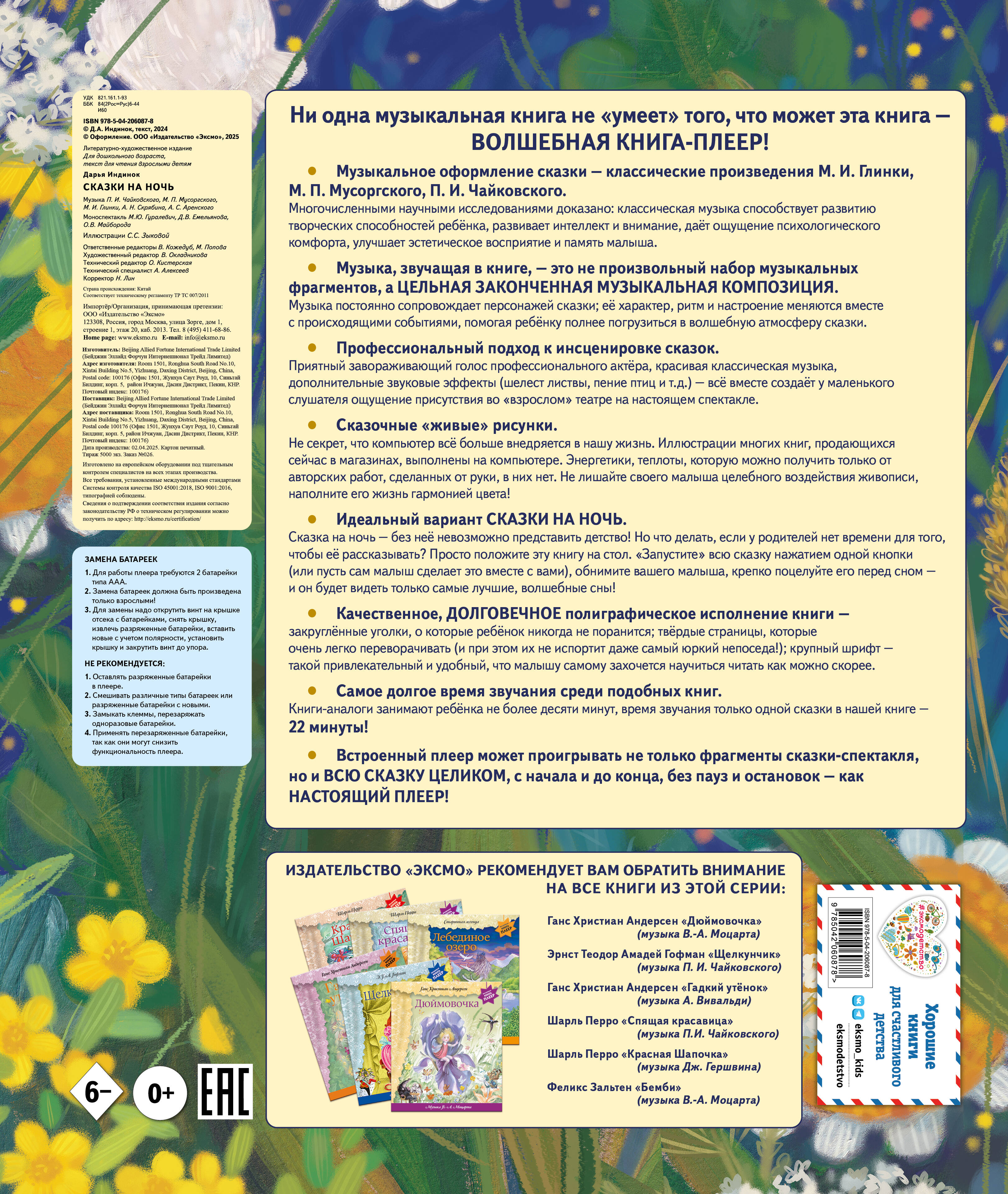 Музыкальная книга-плеер — прекрасное сочетание традиционной книги и современных технологий. Сборник сказок современного автора Дарьи Индинок для малышей и их родителей: добрые истории о дружбе, заботе, внимании, которые так приятно читать перед сном. Красочное иллюстрированное издание дополнено звуковым плеером, который работает от двух батареек типа ААА. Яркие, крупные кнопки на панели модуля позволяют прослушать сказки как по отдельности, так и всю книгу полностью, от начала до конца, а также сделать паузу в прослушивании. Время звучания всех сказок — 22 минуты! Наша книга — это идеальный вариант «сказки на ночь»: пока ребёнок слушает книгу и засыпает, взрослые могут заняться своими делами. Каждая строчка книги-аудиоспектакля, озвученная профессиональными чтецами, сопровождается шедеврами отечественной классики — музыкой Чайковского, Мусоргского, Глинки и т.д.