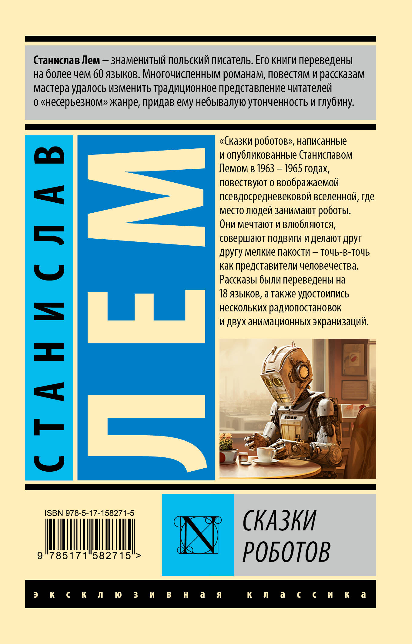 "Сказки роботов", написанные и опубликованные Станиславом Лемом в 1963 – 1965 годах, повествуют о воображаемой псевдосредневековой вселенной, где место людей занимают роботы. Они мечтают и влюбляются, совершают подвиги и делают друг другу мелкие пакости – точь-в-точь как представители человечества. Рассказы были переведены на 18 языков, а также удостоились нескольких радиопостановок и двух анимационных экранизаций.