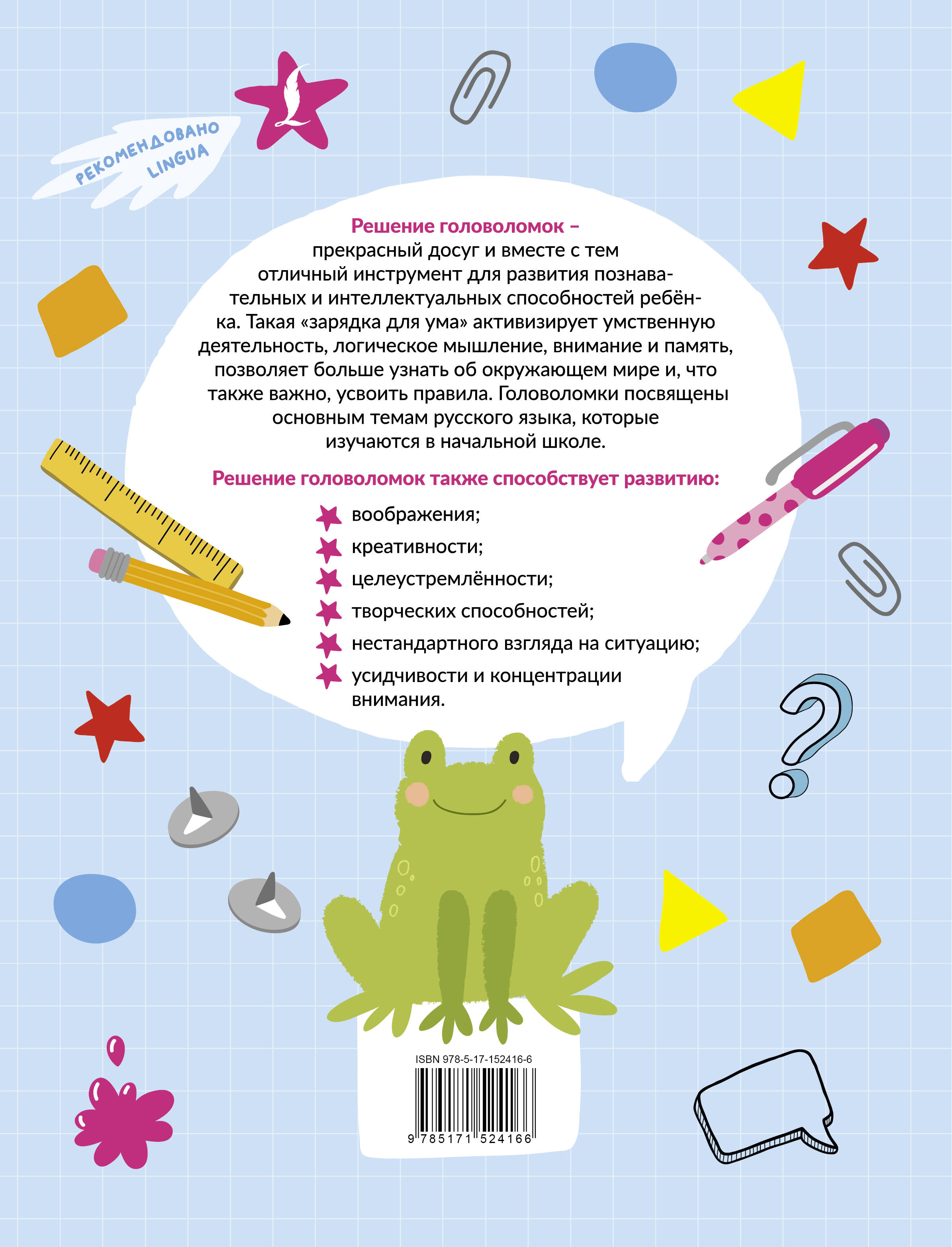 Решение головоломок – прекрасный досуг и вместе с тем отличный инструмент для развития познавательных и интеллектуальных способностей ребёнка. В книге используются кроссворды, филворды, анаграммы, чайнворды и другие задания разного типа. Головоломки посвящены основным темам русского языка, которые изучаются в начальной школе: сочетания ЖИ–ШИ, ЧА–ЩА, суффиксы существительных, правописание Ъ и Ь, О–Ё после шипящих, склонение существительных, спряжение глаголов и другие.
