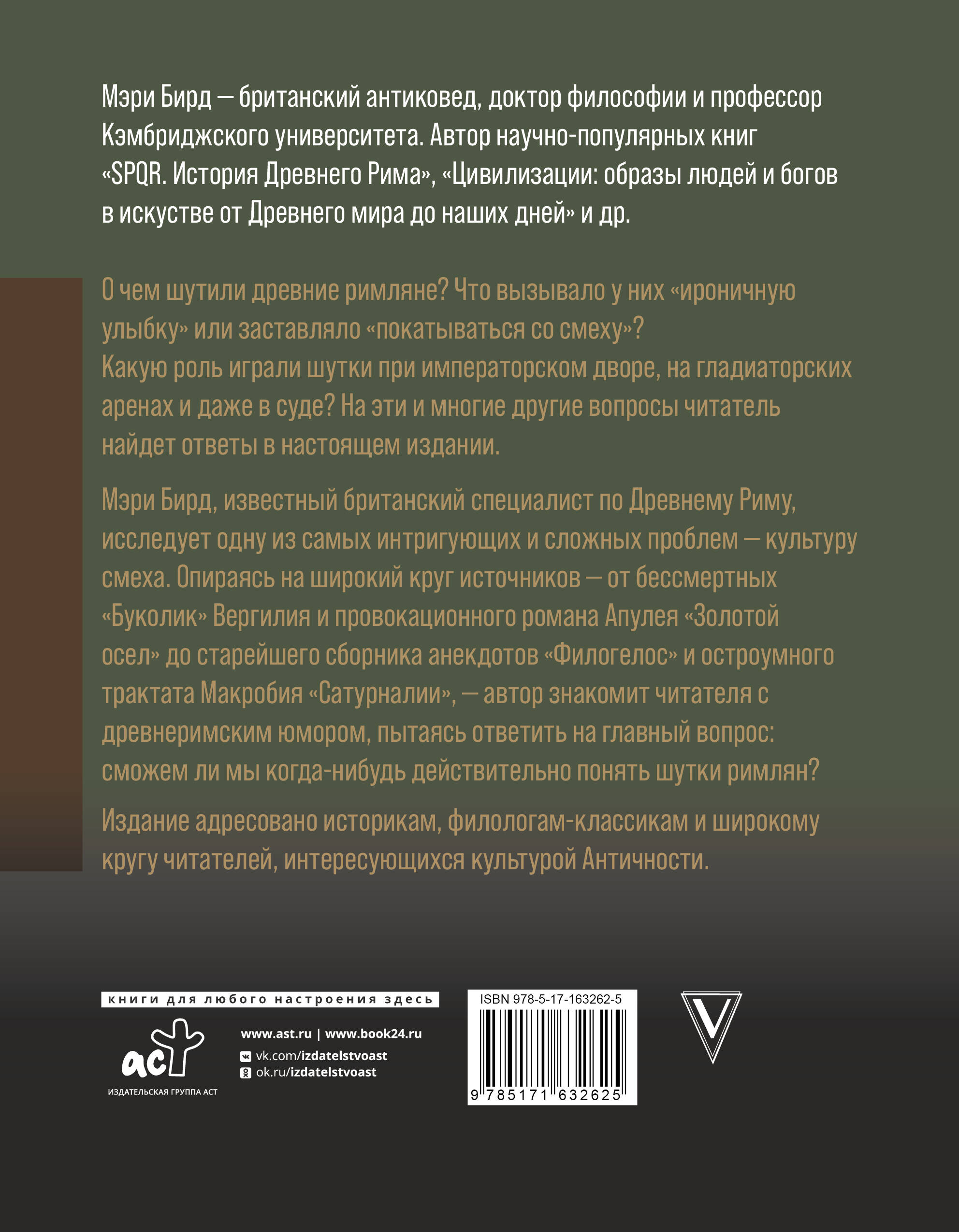 О чем шутили древние римляне? Что вызывало у них "ироничную улыбку" или заставляло "покатываться со смеху"? Какую роль играли шутки при императорском дворе, на гладиаторских аренах и даже в суде? На эти и многие другие вопросы читатель найдет ответы в настоящем издании. Мэри Бирд, известный британский специалист по Древнему Риму, исследует одну из самых интригующих и сложных проблем — культуру смеха. Опираясь на широкий круг источников — от бессмертных "Буколик" Вергилия и провокационного романа Апулея "Золотой осел" до старейшего сборника анекдотов "Филогелос" и остроумного