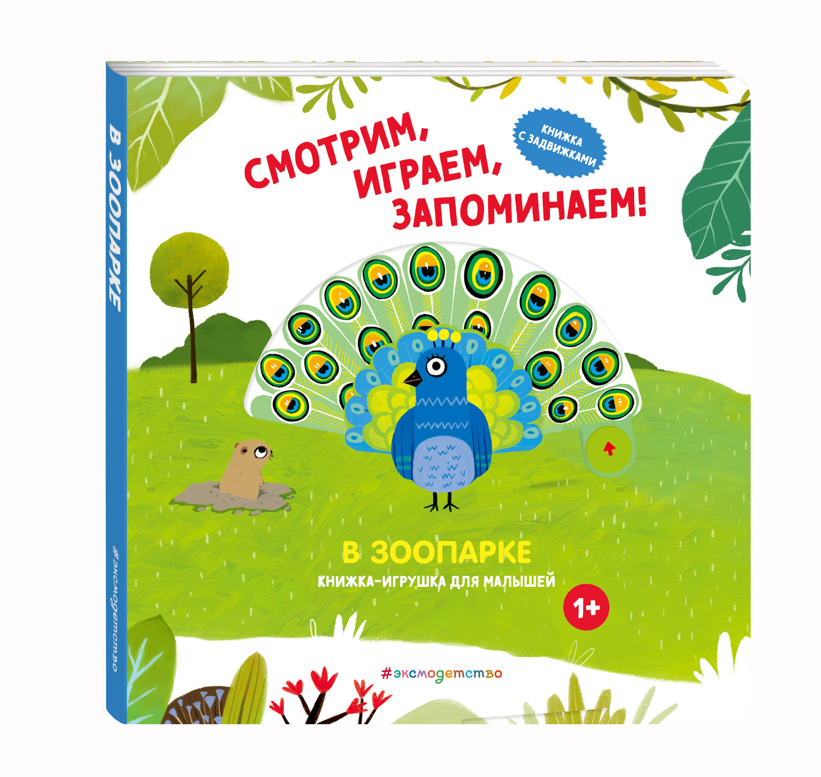 Книга сделана из толстого прочного картона с безопасными скругленными углами — малыш сможет легко переворачивать странички самостоятельно. Игра с книгой начинается прямо с обложки, ведь там находится подвижная деталь!