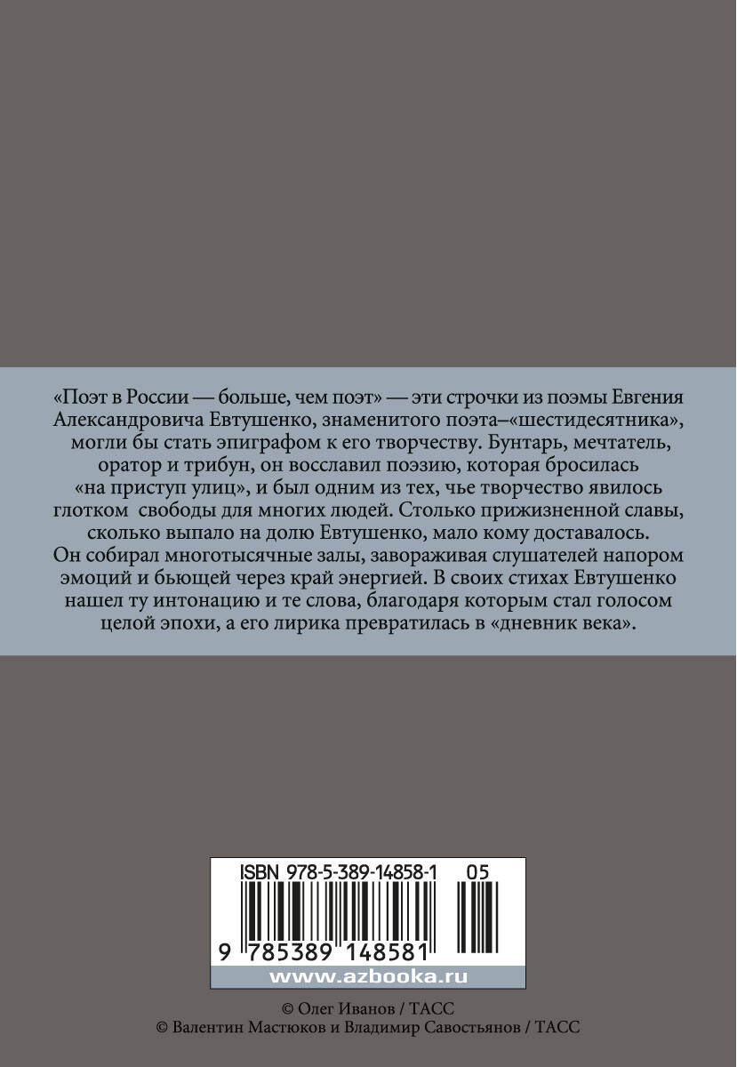 "Поэт в России – больше, чем поэт" – эти строчки из поэмы Евгения Александровича Евтушенко, знаменитого поэта–"шестидесятника", могли бы стать эпиграфом к его творчеству. Бунтарь, мечтатель, оратор и трибун, он восславил поэзию, которая бросилась "на приступ улиц", и был одним из тех, чье творчество явилось глотком свободы для многих людей. Столько прижизненной славы, сколько выпало на долю Евтушенко, мало кому доставалось. Он собирал многотысячные залы, завораживая слушателей напором эмоций и бьющей через край энергией. В своих стихах Евтушенко нашел ту интонацию, и те слова, благодаря которым стал голосом целой эпохи, а его лирика превратилась в "дневник века". Сегодня Евтушенко знают во всем мире, его произведения переведены более чем на семьдесят языков, а на его стихи написаны десятки песен ("Хотят ли русские войны?", "Со мною вот что происходит…", "Ольховая сережка", "А снег повалится, повалится…", "Дай Бог!" и другие). В настоящее издание вошли избранные стихотворения Е. Евтушенко, созданные в разные годы жизни.