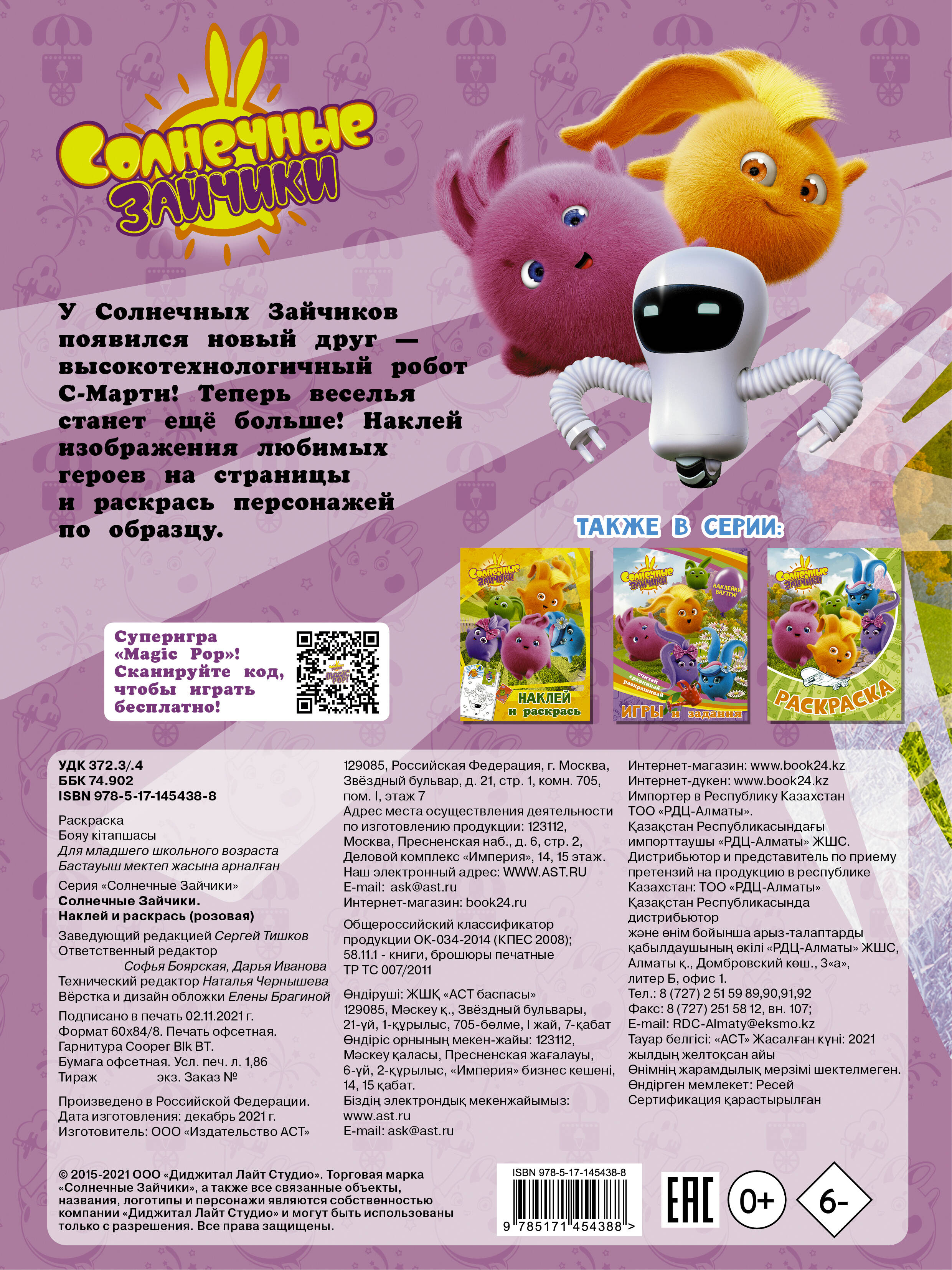 У Солнечных Зайчиков появился новый друг — высокотехнологичный робот С-Марти! Теперь веселья станет ещё больше! Наклей изображения любимых героев на страницы и раскрась персонажей по образцу.