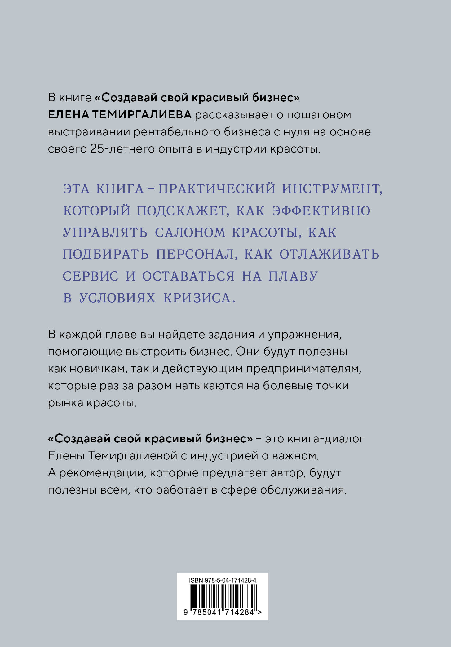 В книге «Создавай свой красивый бизнес» Елена Темиргалиева рассказывает о пошаговом выстраивании рентабельного бизнеса с нуля на основе своего 25-летнего опыта в индустрии красоты.