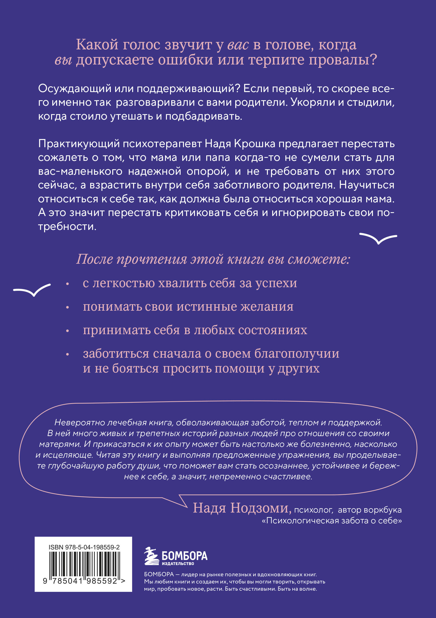 Практикующий психотерапевт Надя Крошка предлагает перестать сожалеть о том, что мама или папа когда-то не сумели стать для вас-маленького надежной опорой, и не требовать от них этого сейчас, а взрастить внутри себя заботливого родителя. Научиться относиться к себе так, как должна была относиться хорошая мама. А это значит, перестать критиковать себя и игнорировать свои потребности.