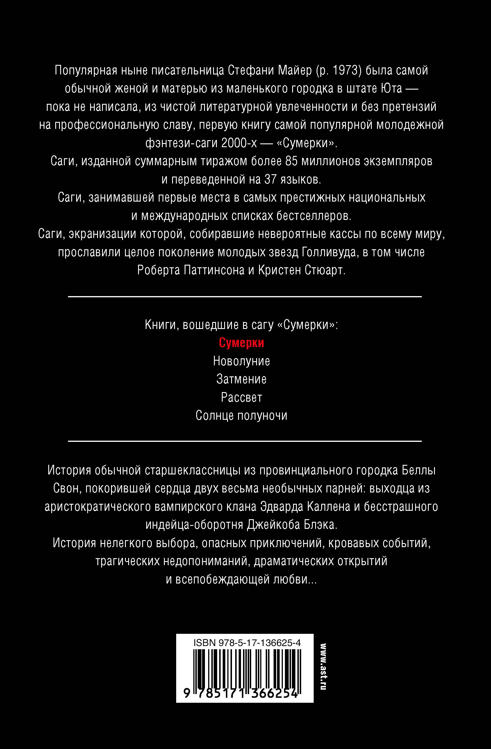 История любви старшеклассницы и вампира покорила сердца миллионов людей. Стефани Майер, создательница саги «Сумерки», два года подряд признавалась лучшей писательницей США, её книги были переведены на 38 языков, а общий тираж «Сумеречной саги» превышает 150 000 000 экземпляров. Сага легла в основу одноимённой киносерии с Робертом Паттисоном и Кристен Стюарт в главных ролях, пять фильмов цикла заработали в мировом прокате свыше 4 миллиардов долларов.