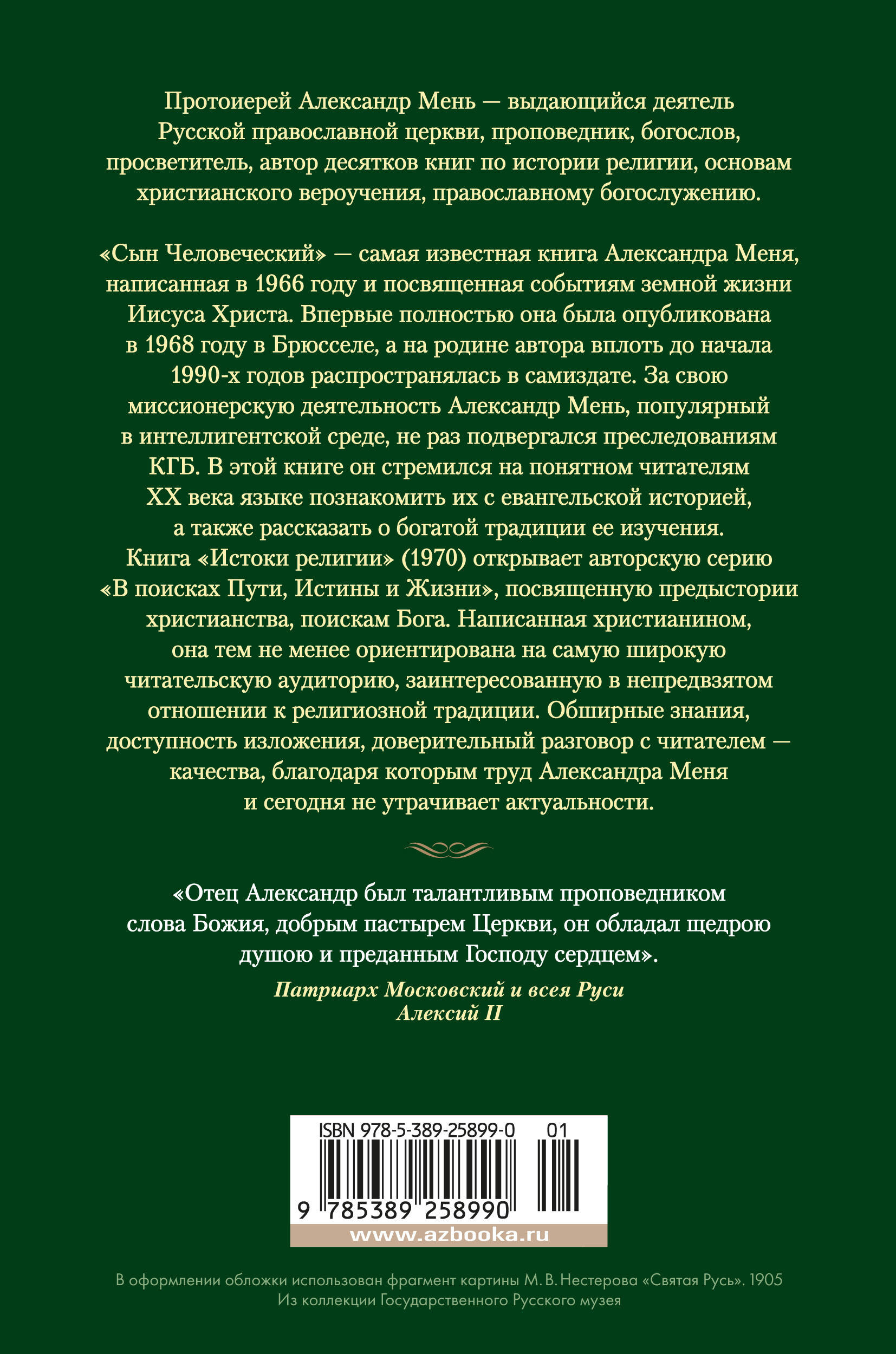 Книга "Истоки религии" (1970) открывает авторскую серию "В поисках Пути, Истины и Жизни", посвященную предыстории христианства, поискам Бога. Написанная христианином, она тем не менее ориентирована на самую широкую читательскую аудиторию, заинтересованную в непредвзятом отношении к религиозной традиции. Обширные знания, доступность изложения, доверительный разговор с читателем — качества, благодаря которым труд Александра Меня и сегодня не утрачивает актуальности.