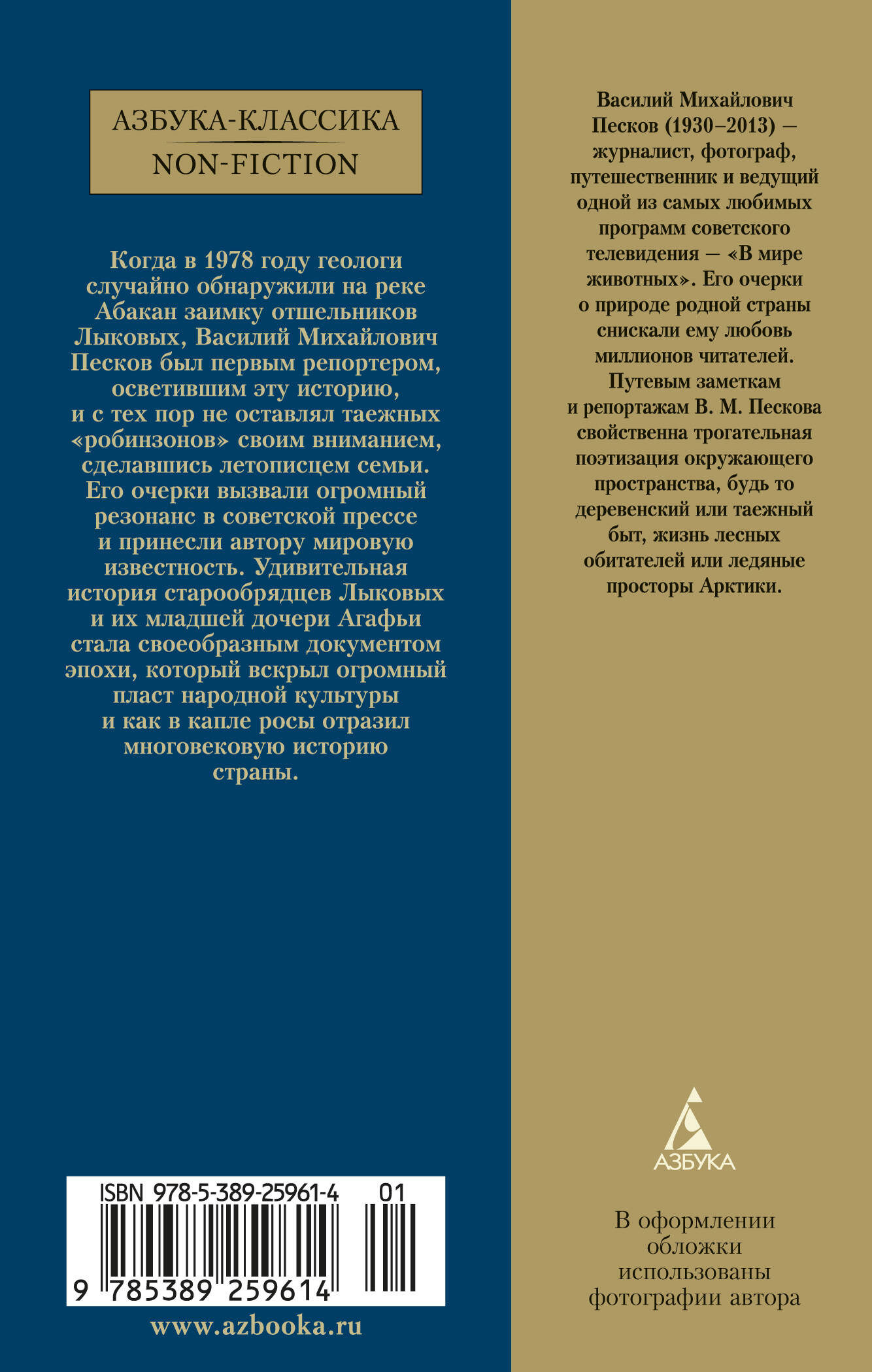Когда в 1978 году геологи случайно обнаружили на реке Абакан заимку отшельников Лыковых, Василий Михайлович Песков был первым репортером, осветившим эту историю, и с тех пор не оставлял таежных "робинзонов" своим вниманием, сделавшись летописцем семьи. Его очерки вызвали огромный резонанс в советской прессе и принесли автору мировую известность. Удивительная история старообрядцев Лыковых и их младшей дочери Агафьи стала своеобразным документом эпохи, который вскрыл огромный пласт народной истории страны.