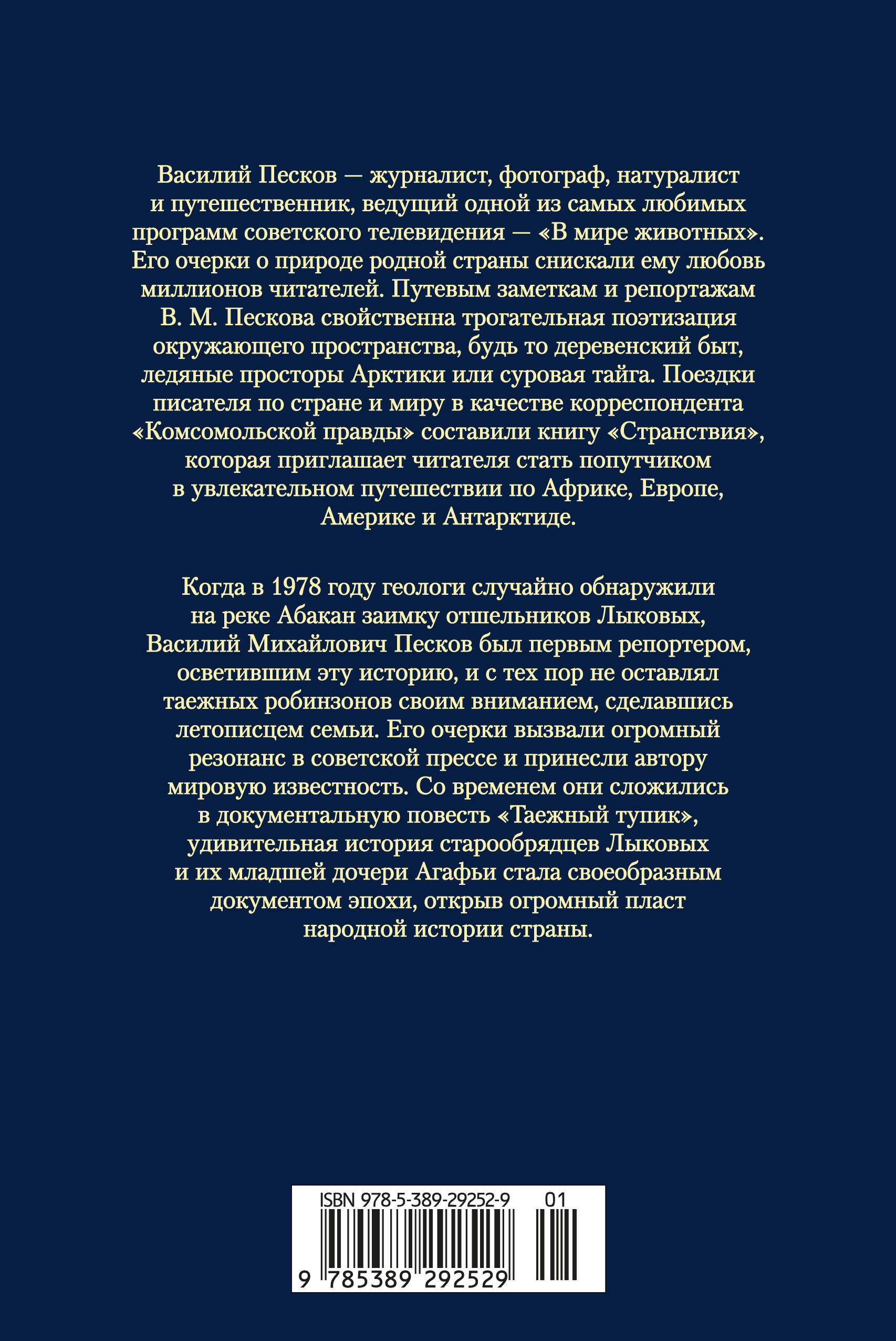 В издание вошли знаковые произведения В. М. Пескова — знаменитый «Таежный тупик», повествующий о семье отшельников-старообрядцев Лыковых, и «Странствия» — собрание путевых очерков о поездках по Африке, Америке, Европе и Антарктиде. Книга приглашает читателя в увлекательное путешествие и наглядно показывает, как сильно и быстро меняется мир и как много в нем неожиданных открытий.