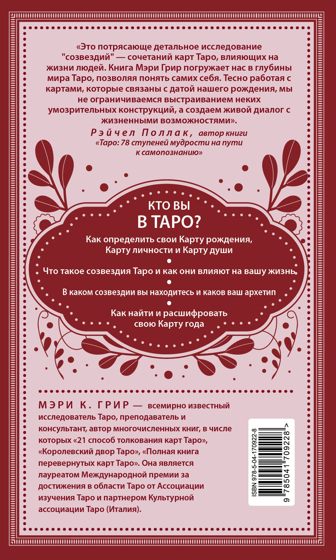 «Это потрясающе детальное исследование "созвездий" — сочетаний карт Таро, влияющих на жизни людей. Книга Мэри Грир погружает нас в глубины мира Таро, позволяя понять самих себя. Тесно работая с картами, которые связаны с датой нашего рождения, мы не ограничиваемся выстраиванием неких умозрительных конструкций, а создаем живой диалог с жизненными возможностями». — Рэйчел Поллак, автор книги «Таро: 78 ступеней мудрости на пути к самопознанию»