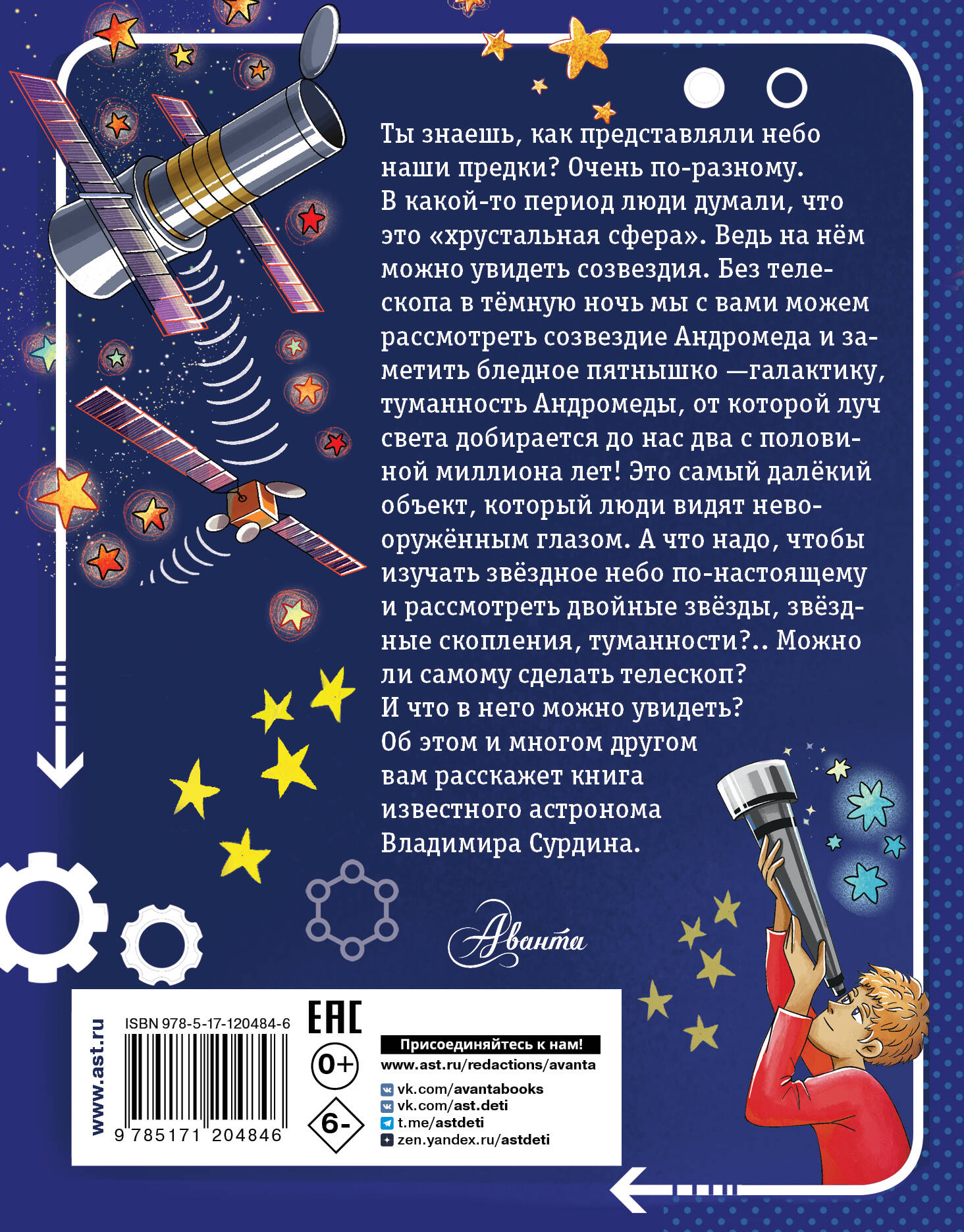 Книга Владимира Сурдина рассказывает самым маленьким любителям астрономии о том, как самостоятельно научиться изучать звёздное небо. Любой, кто прочтёт эту книгу, узнает, что звёзды светят нам не только потому, что ими приятно любоваться. По звёздам можно определять время и ориентироваться в пространстве. С помощью собственных пальцев легко научиться измерять расстояния между космическими телами. А если всеми этими приёмами овладеть уже удалось, можно попробовать собрать свой собственный телескоп из подручных материалов. Да, о том, как это сделать, тоже можно прочитать на страницах этой книги.