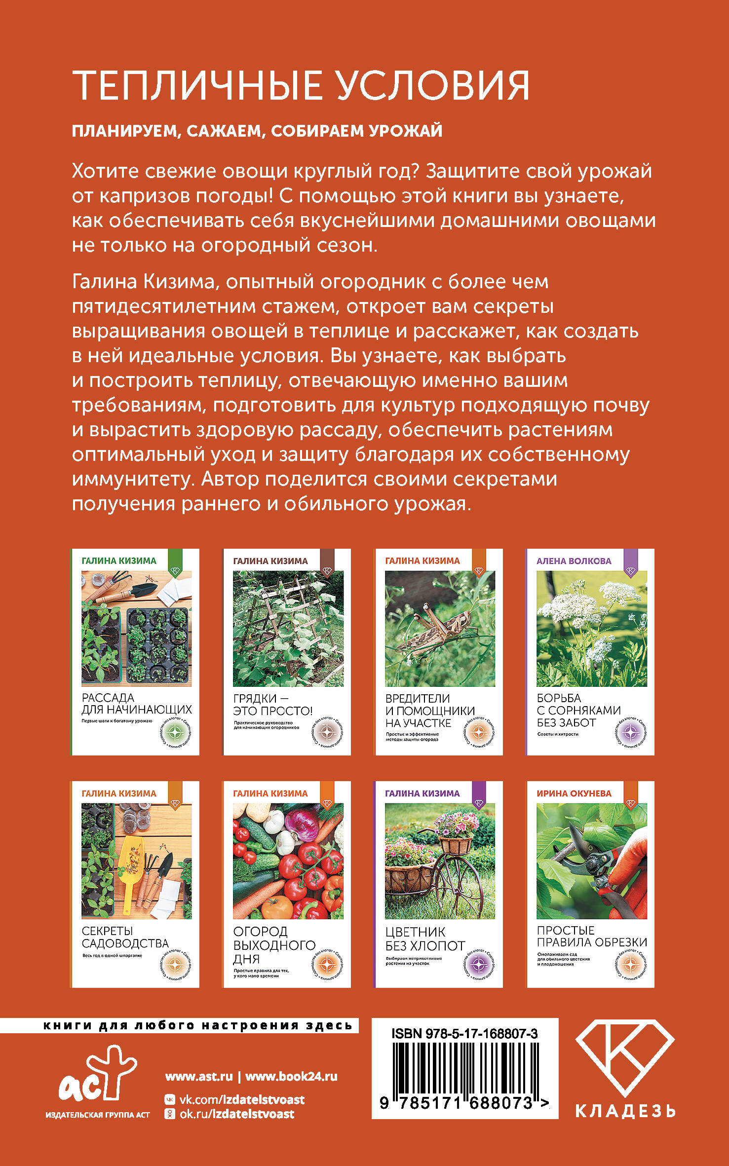 Галина Кизима, опытный огородник с более чем пятидесятилетним стажем, откроет вам секреты выращивания овощей в теплице и расскажет, как создать в ней идеальные условия. Вы узнаете, как выбрать и построить теплицу, отвечающую именно вашим требованиям, подготовить для культур подходящую почву и вырастить здоровую рассаду, обеспечить растениям оптимальный уход и защиту благодаря их собственному иммунитету.