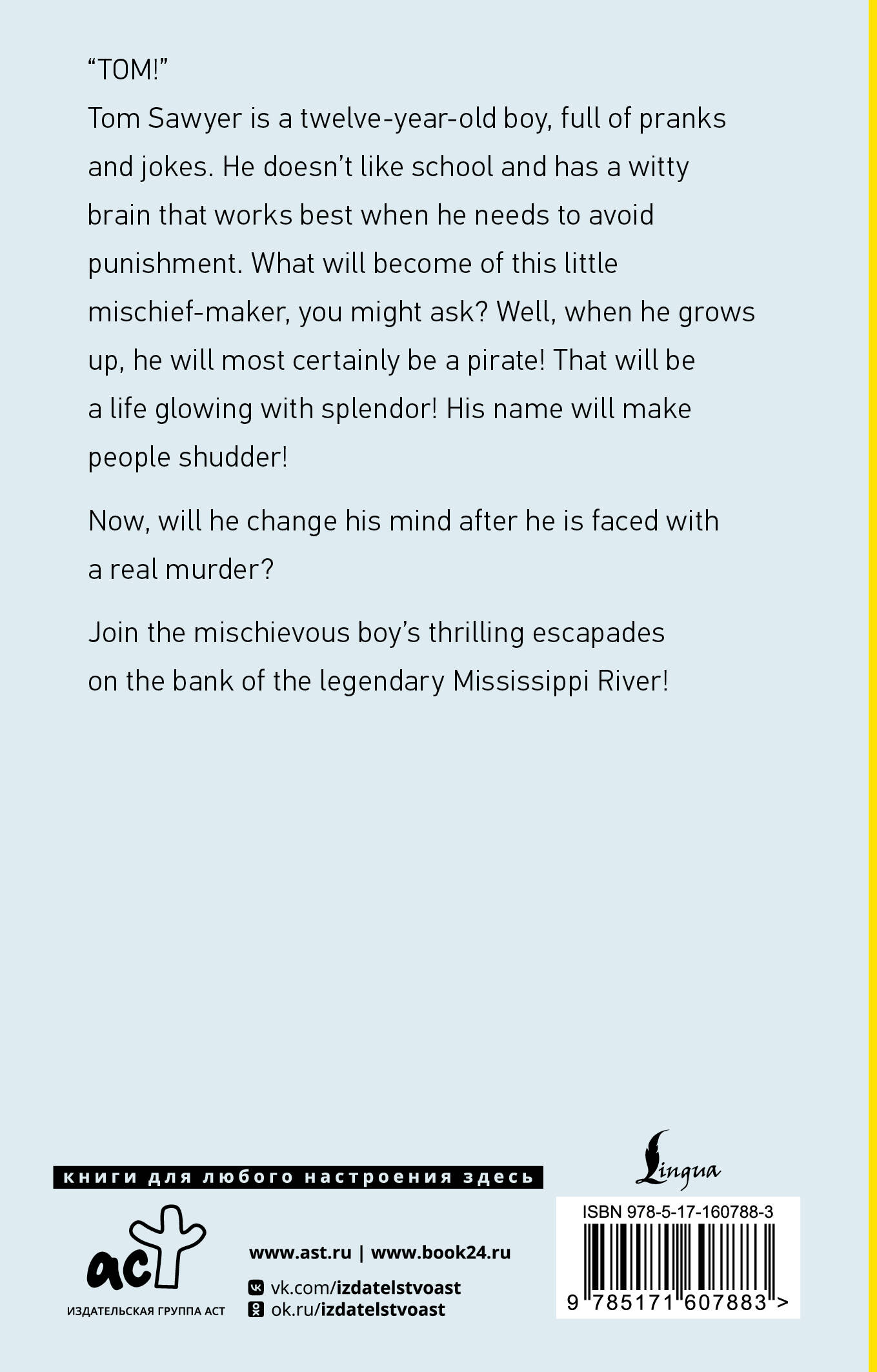 Следите за приключениями Тома Сойера и его лучшего друга Гекльберри Финна в книге, полюбившейся многим поколениям читателей по всему миру! Насладитесь богатым и красочным языком Марка Твена без адаптации и сокращений!