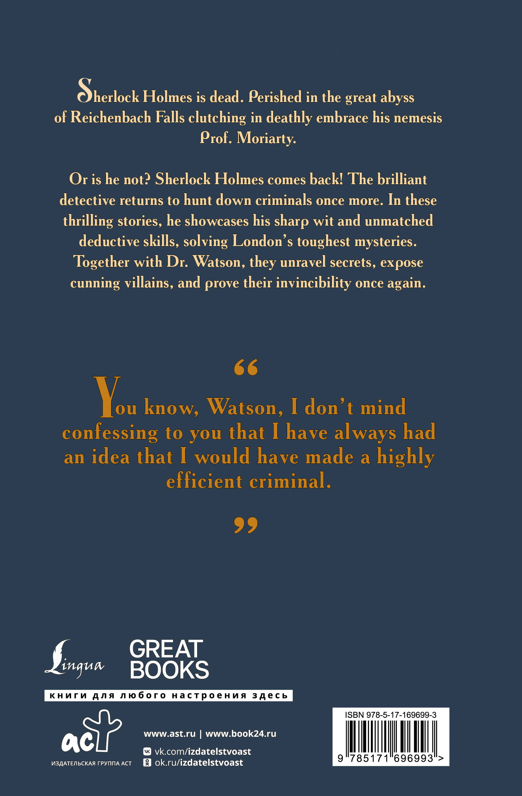 "Возвращение Шерлока Холмса" - это сборник из 13 рассказов про вашего любимого детектива. Шерлок Холмс, канувший в бездну Рейхенбахского водопада вместе со своим врагом, профессором Мориарти, неожиданно возвращается. Каким образом ему удалось выжить? Ответ вы найдете на страницах этой книги.