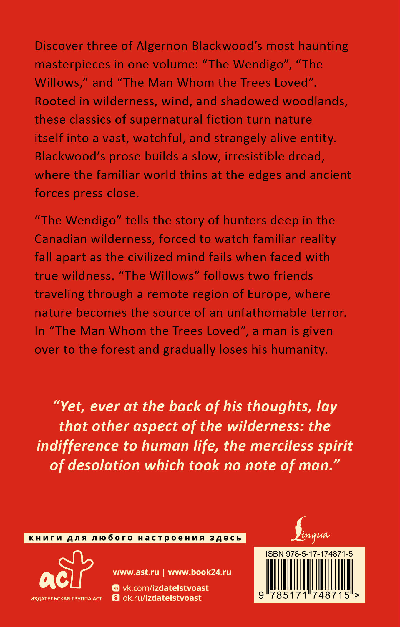 В "The Wendigo" охота в канадской глуши превращается в кошмарный опыт встречи с древним духом леса, который ломает тело и сознание одного из героев, а вместе с ним — веру остальных в привычный, рациональный мир. В "The Willows" двое путешественников попадают в странный, почти нереальный пейзаж, где природа оживает, и шёпот ветра превращается в предвестие чего-то космически враждебного. В "The Man Whom the Trees Loved" тихая любовь к природе постепенно оборачивается одержимостью и медленным растворением человеческого "я" в воле леса.