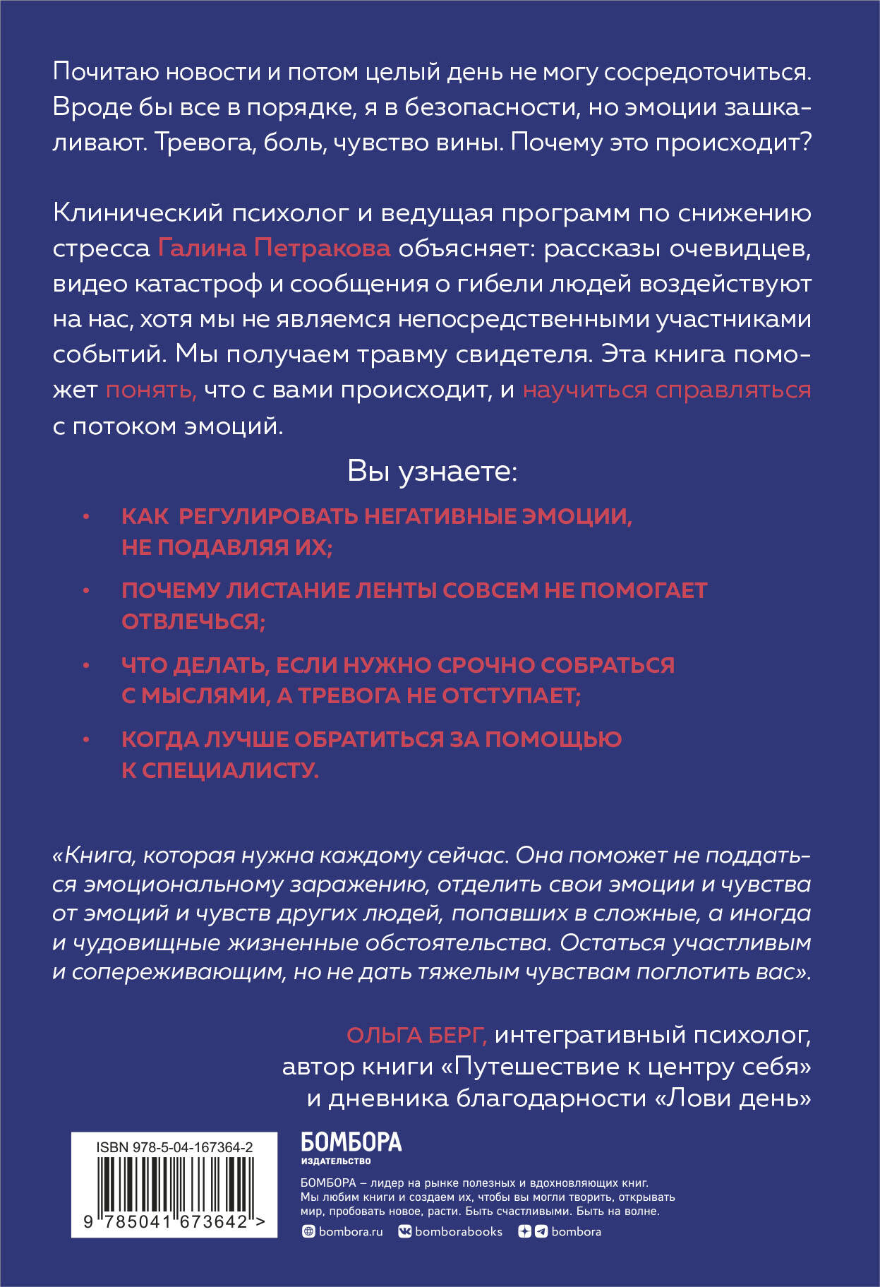 Клинический психолог и ведущая программ по снижению стресса, Галина Петракова, объясняет: рассказы очевидцев, видео катастроф и сообщения о гибели людей воздействует на нас, хотя мы не являемся непосредственными участниками событий. Мы получаем травму свидетеля. Эта книга поможет понять, что с вами происходит, и научиться справляться с потоком эмоций.