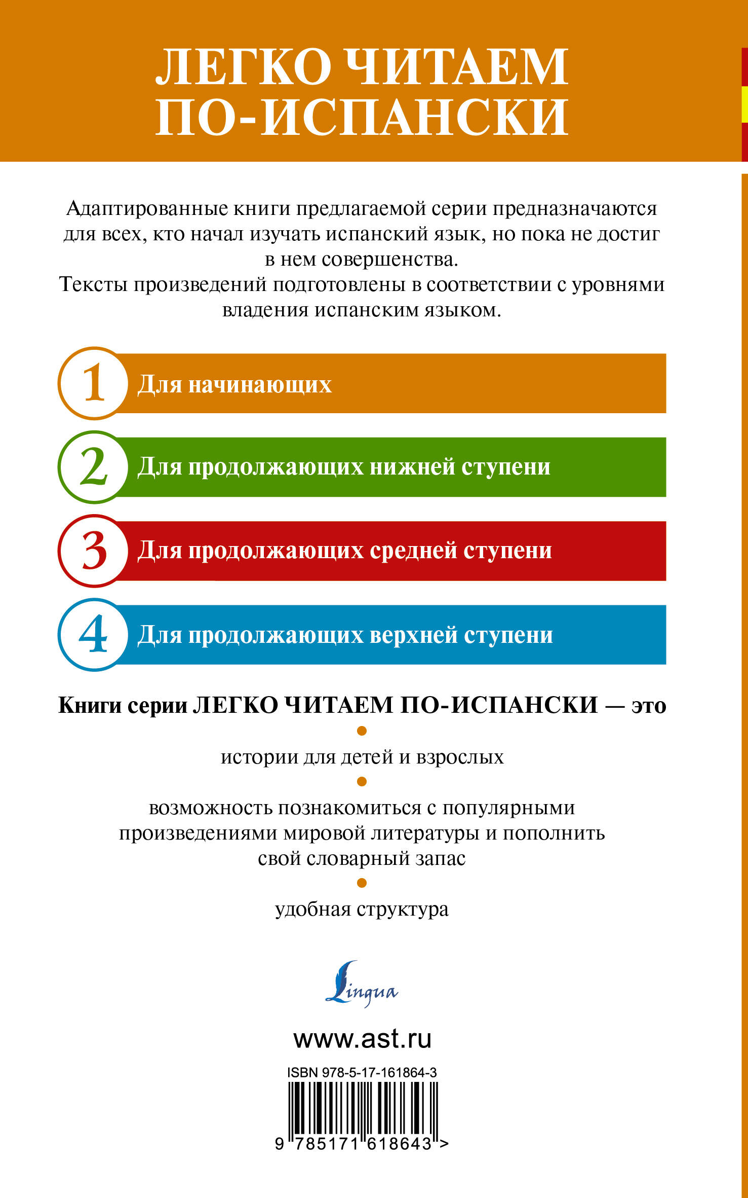 Текст книги сокращён, адаптирован и сопровождается комментариями и упражнениями с ответами. Также в конце книги вы найдёте небольшой испанско-русский словарь, который поможет вам с выполнением заданий.