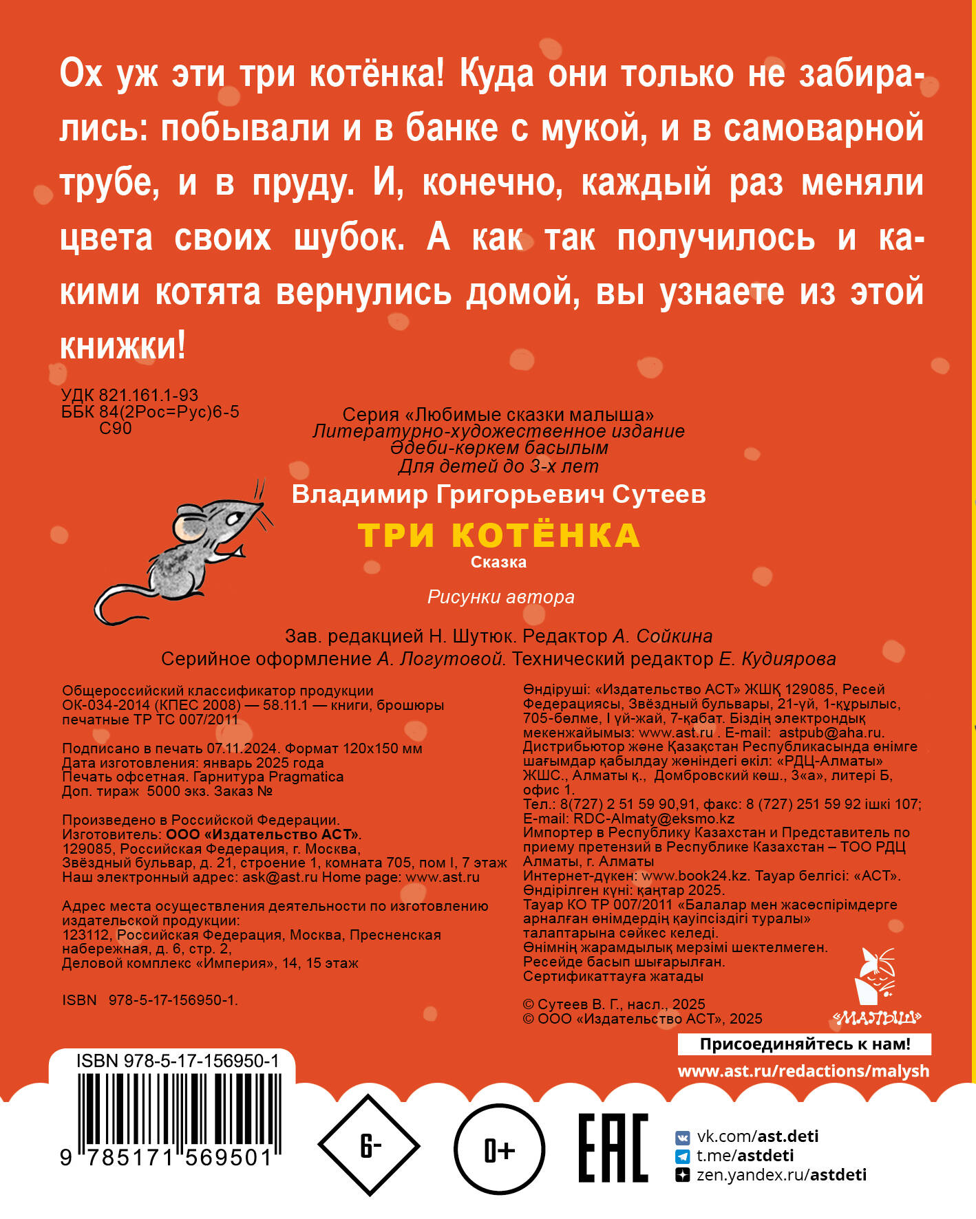 Ох уж эти три котёнка! Куда они только не забирались: побывали и в банке с мукой, и в самоварной трубе, и в пруду. И, конечно, каждый раз меняли цвета своих шубок. А как так получилось и какими котята вернулись домой, вы узнаете из этой книжки!