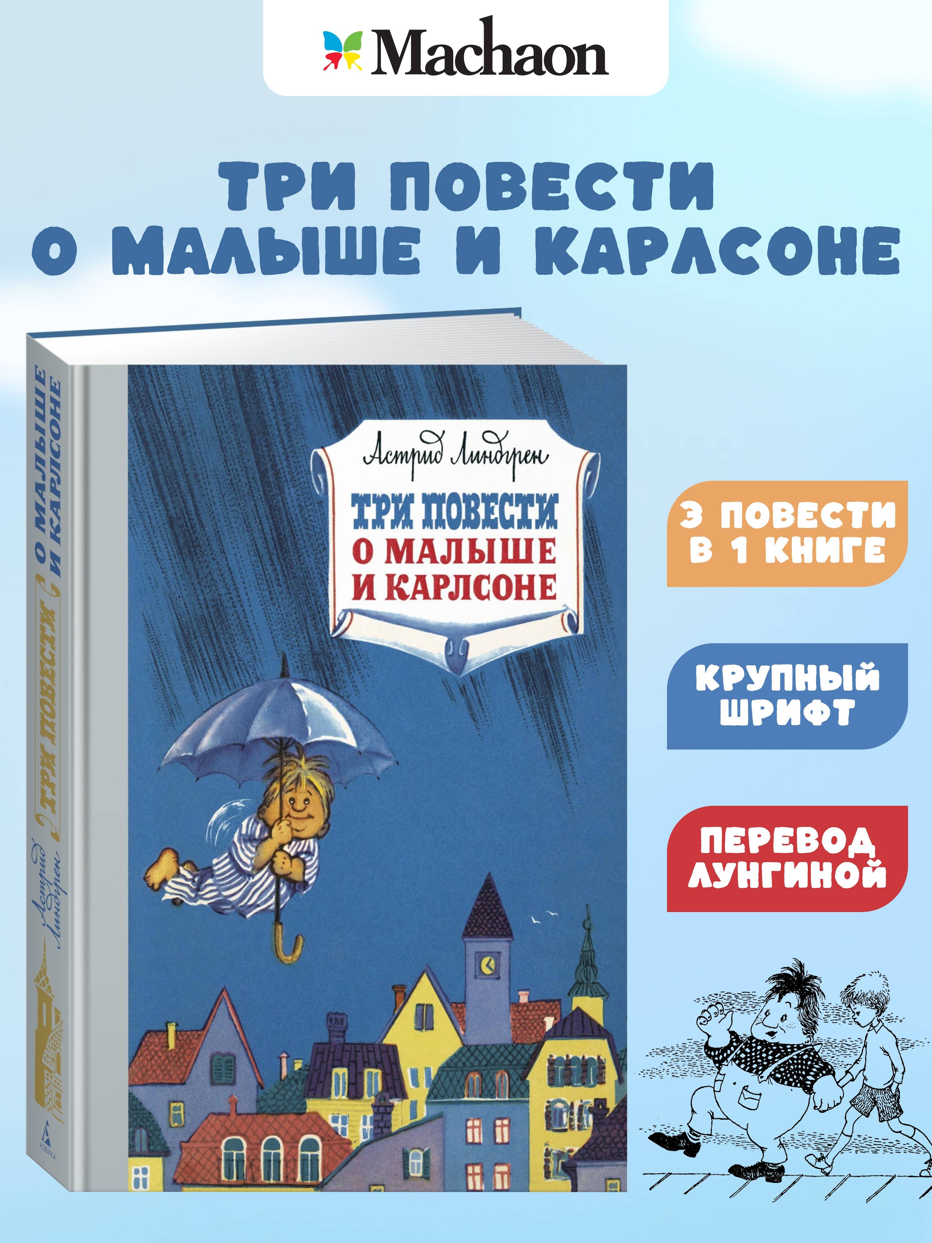 Книга замечательной шведской писательницы Астрид Линдгрен, лауреата многих престижных премий, в том числе золотой медали Андерсена, о Малыше и Карлсоне, который живёт на крыше. Этого толстенького забавного человечка с моторчиком и пропеллером на спине знают и любят дети всего мира. У него непоседливый нрав, и он полон выдумок и фантазий. Он может превратить твой день в тарарам, но с ним никогда не бывает скучно, потому что его девиз: "Надо, чтобы было весело и забавно, а то я не играю!"