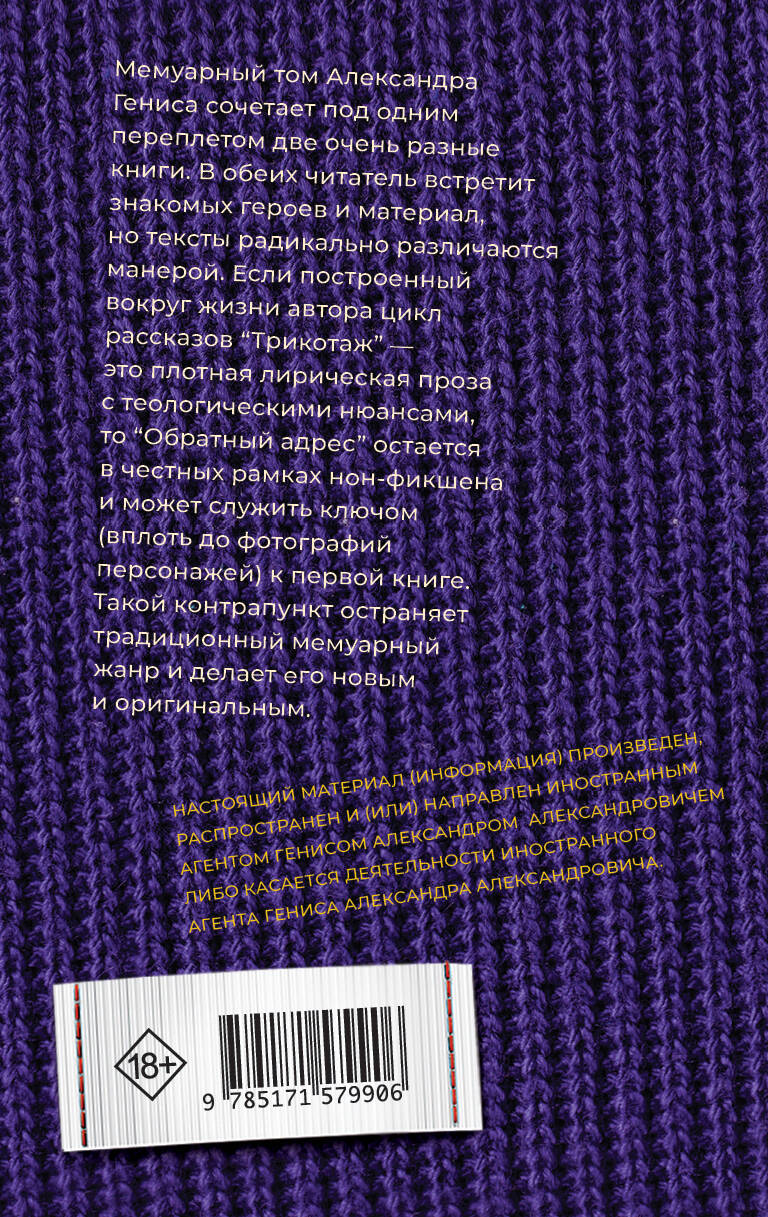 Долгожданное переиздание. «Трикотаж» был издан более 20 лет назад и, возможно, не знаком новому поколению читателей. В союзе с «Обратным адресом» книга дополняет и раскрывает все сюжетные линии.