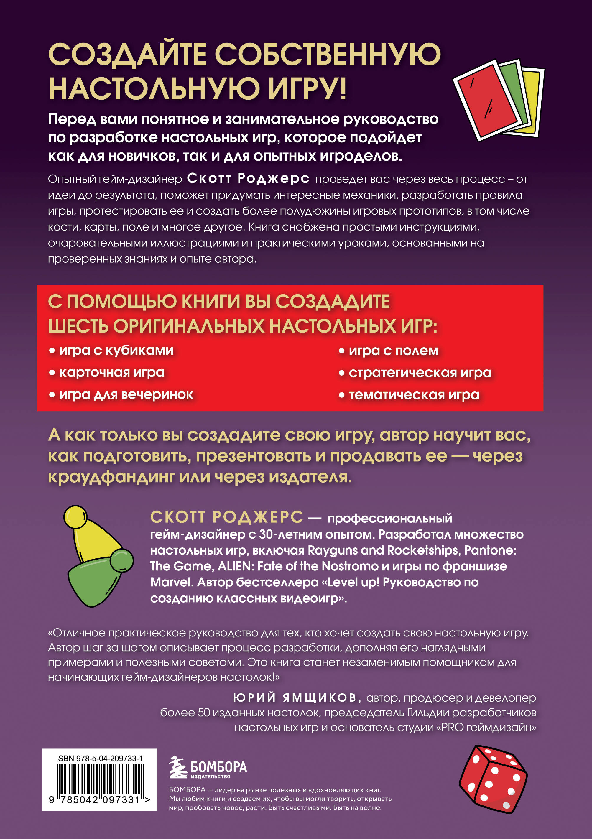 «Отличное практическое руководство для тех, кто хочет создать свою настольную игру. Автор шаг за шагом описывает процесс разработки, дополняя его наглядными примерами и полезными советами. Эта книга станет незаменимым помощником для начинающих гейм-дизайнеров настолок!» — ЮРИЙ ЯМЩИКОВ, автор, продюсер и девелопер более 50 изданных настолок, председатель Гильдии разработчиков настольных игр и основатель студии «PRO геймдизайн»