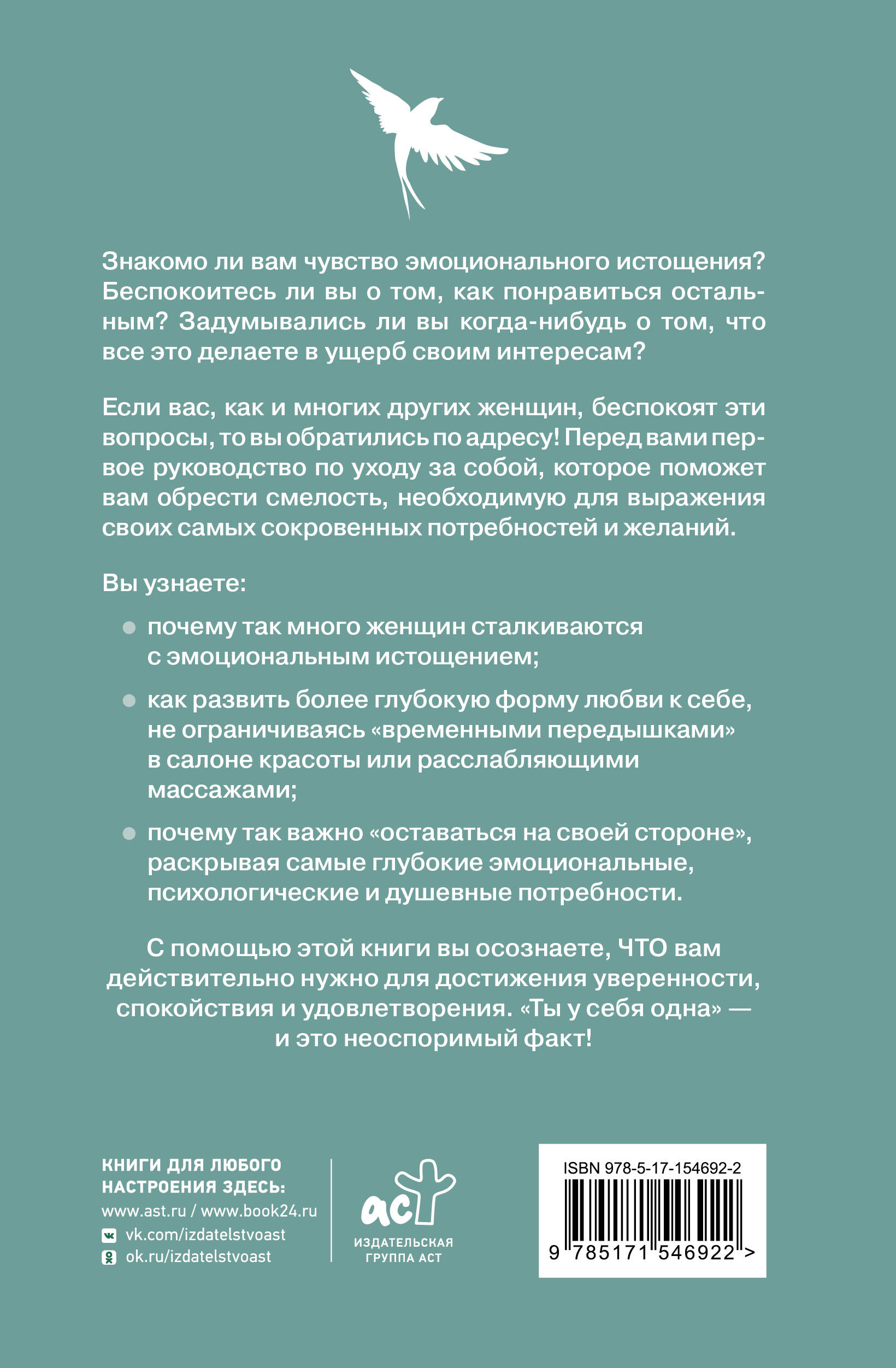 С помощью этой книги вы осознаете, ЧТО вам действительно нужно для достижения уверенности, спокойствия и удовлетворения. "Ты у себя одна" — и это неоспоримый факт!