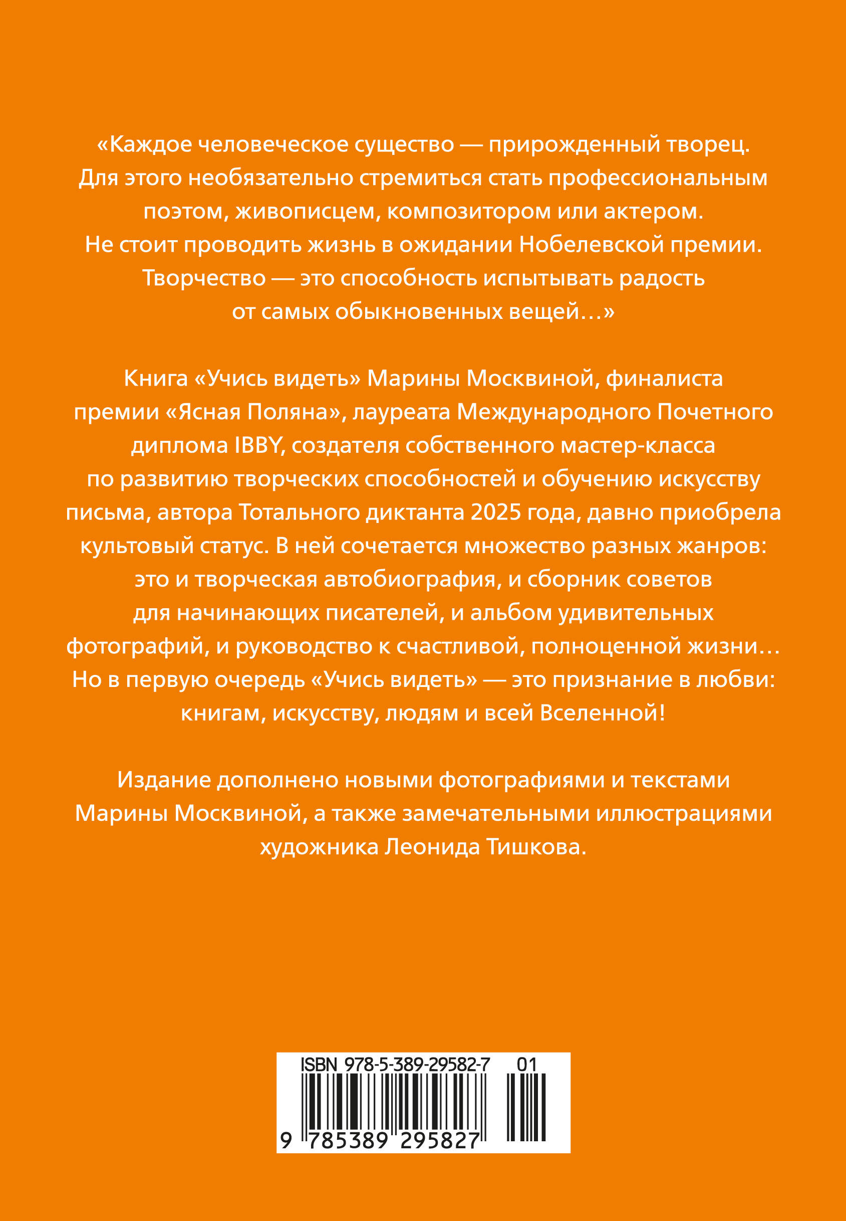 Книга «Учись видеть» Марины Москвиной давно приобрела культовый статус. В ней сочетается множество разных жанров: это и творческая автобиография, и сборник советов для начинающих писателей, и альбом удивительных фотографий, и руководство к счастливой, полноценной жизни… Но в первую очередь «Учись видеть» — это признание в любви: книгам, искусству, людям и всей Вселенной!
