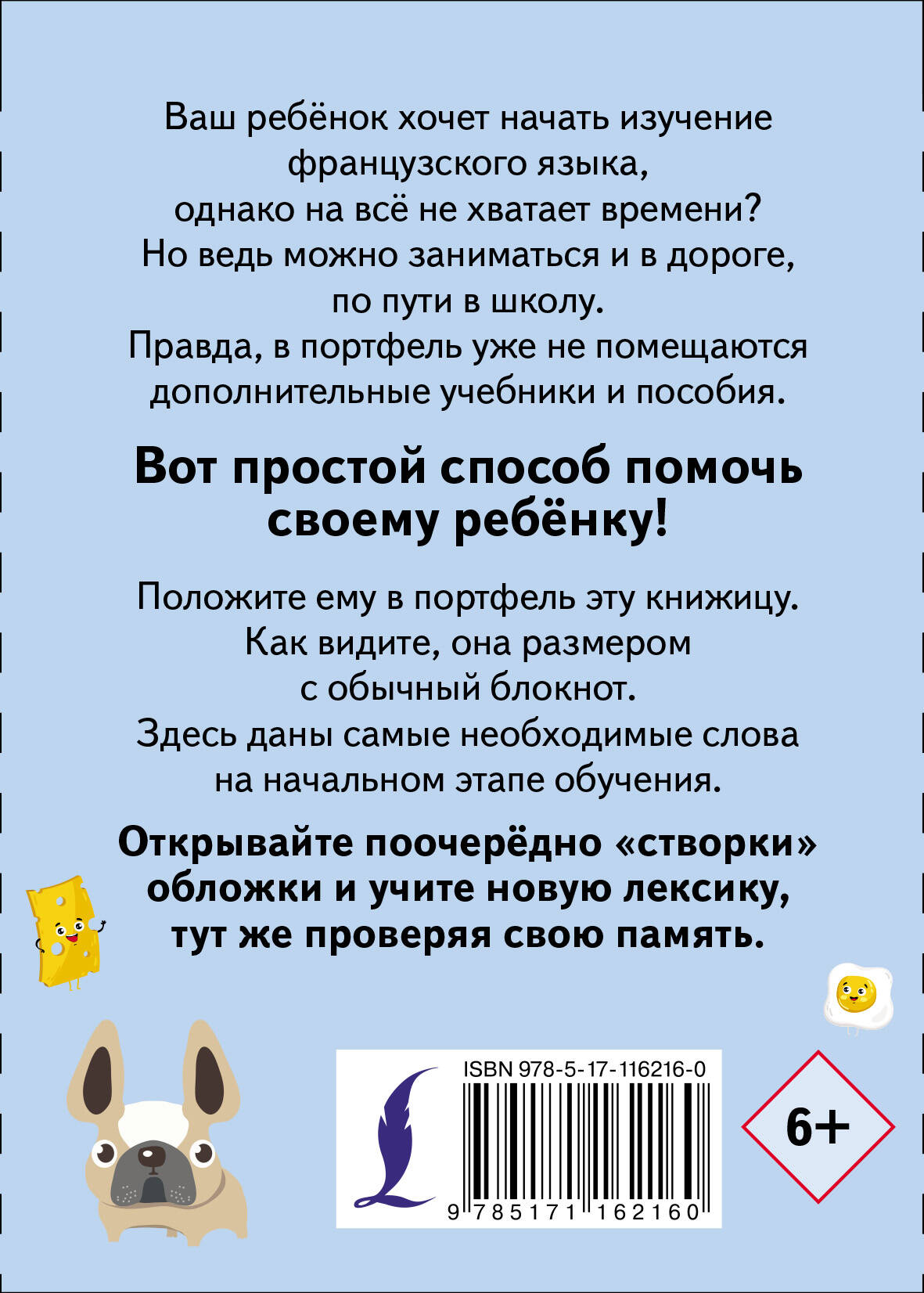 Ваш ребёнок хочет начать изучение французского языка, однако на всё не хватает времени. Но ведь можно заниматься и в дороге, по пути в школу. Правда, в портфель уже не помещаются дополнительные учебники и пособия. Вот простой способ помочь своему ребёнку! Положите ему в портфель эту книжицу. Как видите, она размером с обычный блокнот. Здесь даны самые необходимые слова на начальном этапе обучения. Открывайте поочерёдно "створки" обложки и учите новую лексику, тут же проверяя свою память.