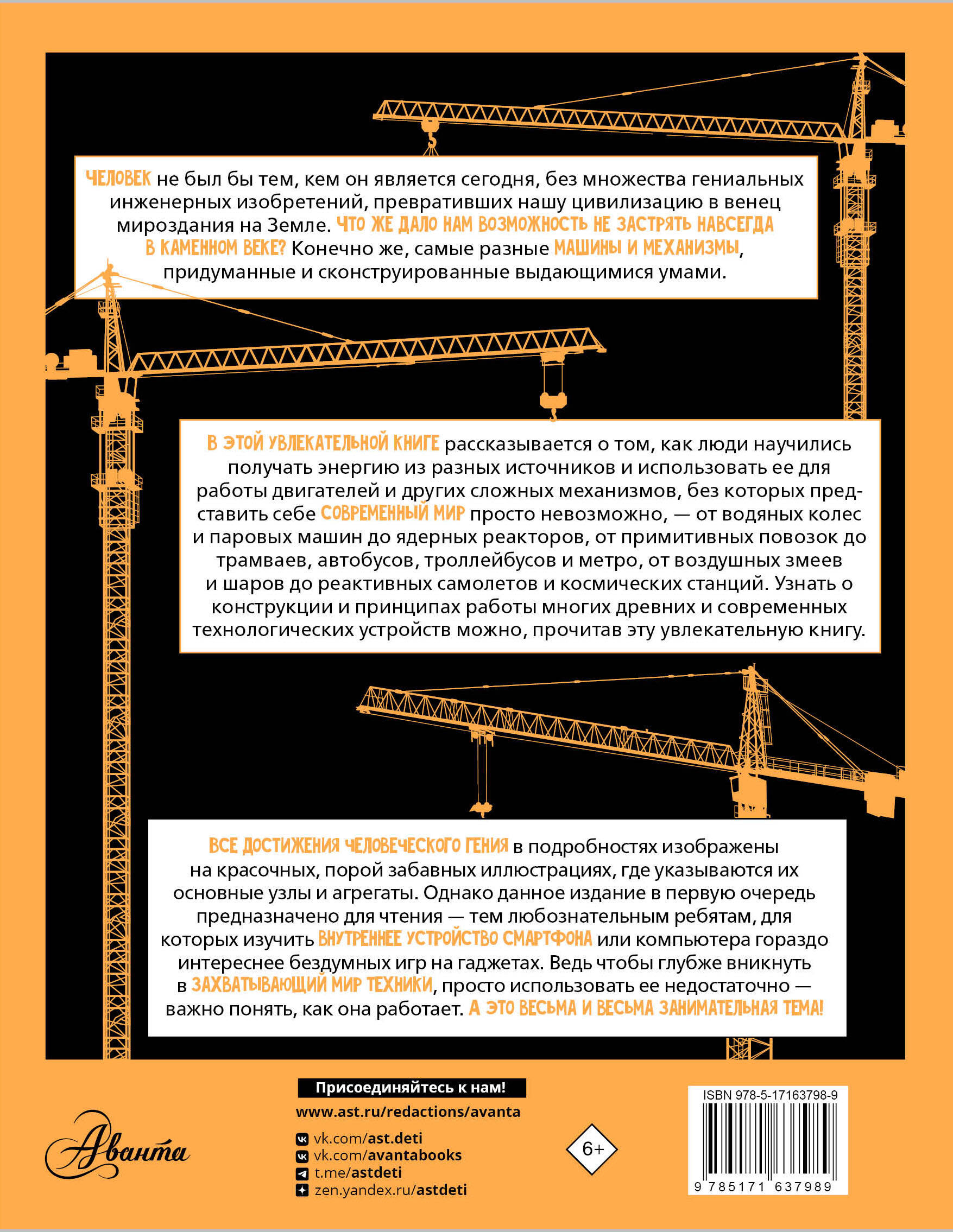 Человек не был бы тем, кем он является сегодня, без множества гениальных инженерных изобретений, превративших нашу цивилизацию в венец мироздания на Земле. Что же дало нам возможность не застрять навсегда в каменном веке? Конечно же, самые разные машины и механизмы, придуманные и сконструированные выдающимися умами. В этой увлекательной книге рассказывается о том, как люди научились получать энергию из разных источников и использовать ее для работы двигателей и других сложных механизмов, без которых представить себе современный мир просто невозможно, — от водяных колес и паровых машин до ядерных реакторов, от примитивных повозок до трамваев, автобусов, троллейбусов и метро, от воздушных змеев и шаров до реактивных самолетов и космических станций. Узнать о конструкции и принципах работы многих древних и современных технологических устройств можно, прочитав эту увлекательную книгу. Все достижения человеческого гения в подробностях изображены на красочных, порой забавных иллюстрациях, где указываются их основные узлы и агрегаты. Однако данное издание в первую очередь предназначено для чтения — тем любознательным ребятам, для которых изучить внутреннее устройство смартфона или компьютера гораздо интереснее бездумных игр на гаджетах. Ведь чтобы глубже вникнуть в захватывающий мир техники, просто использовать ее недостаточно — важно понять, как она работает. А это весьма и весьма занимательная тема!