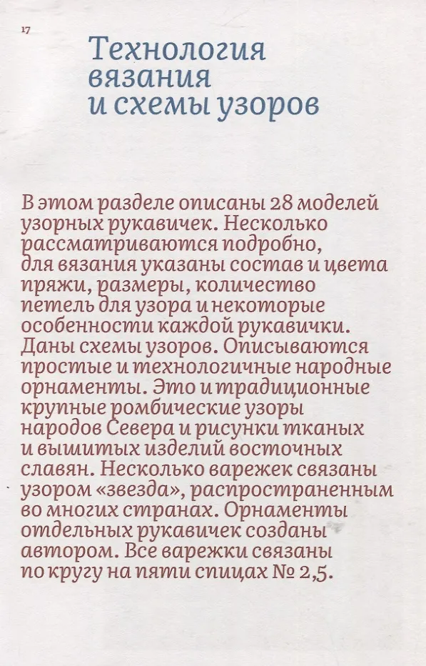 Эта книга о многоцветном узорном вязании на спицах. Рукавички можно украсить как традиционными мотивами Русского Севера, так и современными орнаментами. Книга поможет освоить вязание по кругу, которое только на первый взгляд кажется сложным. Для каждого изделия приведены подробные описания и схемы. Статья Татьяны Зиминой, ведущего сотрудника Российского этнографического музея, познакомит с историей вязания, даст обзор коллекции музея, сведения о локальных названиях, способах ношения, принадлежности к костюмному комплексу.