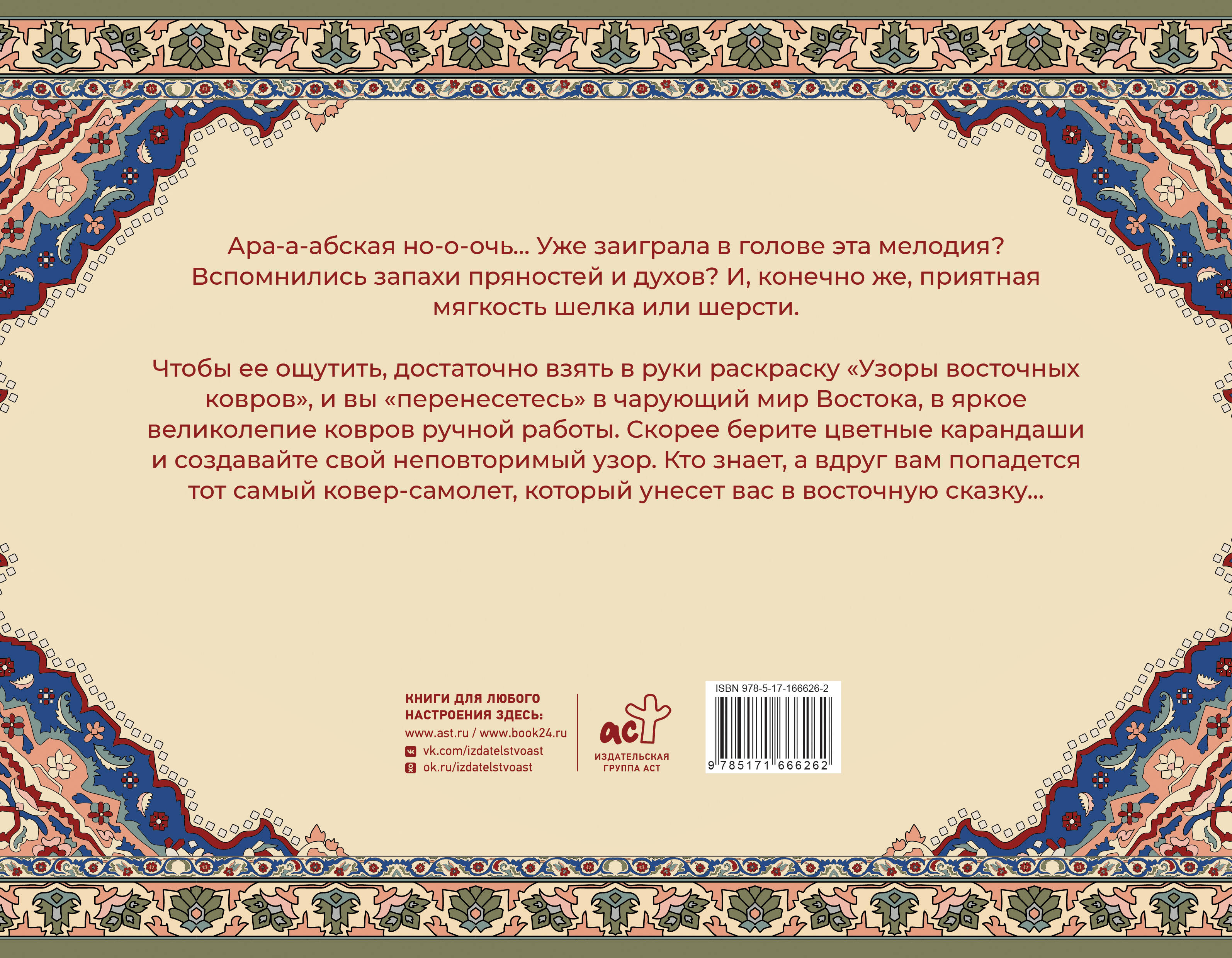 Ара-а-абская но-о-очь… Чтобы ее ощутить, достаточно взять в руки раскраску «Узоры восточных ковров», и вы «перенесетесь» в чарующий мир Востока, в яркое великолепие ковров ручной работы. Оживите восточные ковры с помощью красок или фломастеров – плотная бумага выдержит все ваши творческие эксперименты.